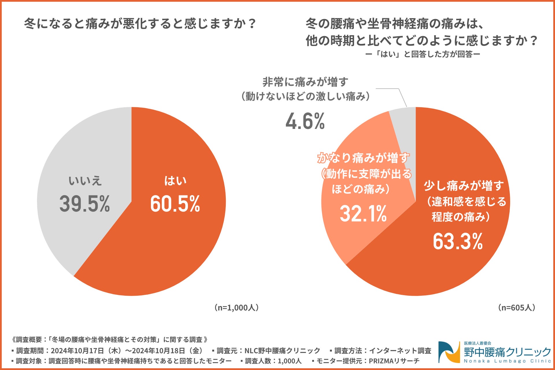 野中腰痛クリニック(所在地:大阪府大阪市東淀川区、医療法人蒼優会理事長:野中 康行)は、冬に腰痛や坐骨神経痛が悪化した経験がある方を対象に「冬場の腰痛や坐骨神経痛とその対策」に関する調査を実施しました。