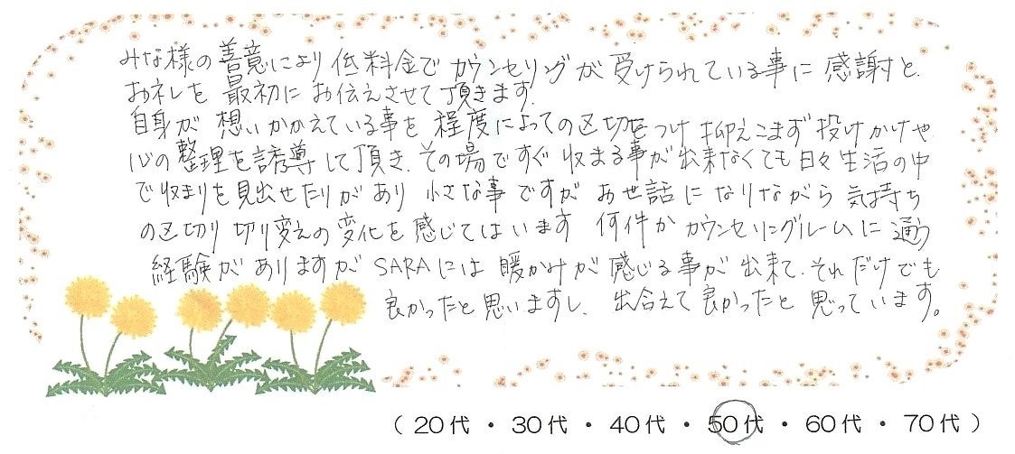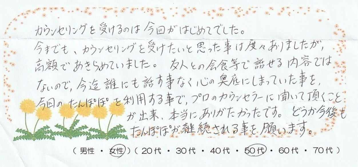 2019年からは、カウンセリングを必要としていながら経済的な理由によってカウンセリングが受けられない、或いは適切な頻度でカウンセリングに通うことができないという、生活保護世帯および住民税非課税世帯の方々を対象とした新しい支援として、通常料金の半額でカウンセリングを提供する「ギフトカウンセリング たんぽぽ」を開始致しました。この活動にもみなさまのご支援を使わせていただいております。