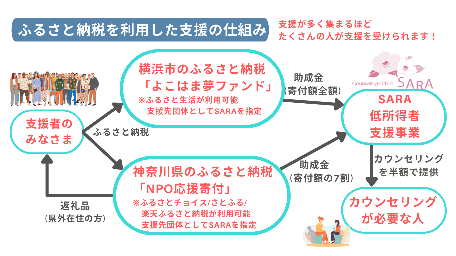 NPO法人カウンセリングオフィスSARAは、「もっと多くの人にカウンセリングを」をモットーに、地域のメンタルヘルス支援に取り組んでいます。April Dreamを通じて、経済的・心理的なハードルによって支援につながりにくい方にも、必要な心のケアが届く社会を目指し、行政からの支援だけではなく、皆さま一人ひとりの寄付・賛助会員・ふるさと納税などによる様々なご支援をいただき、活動の輪を広げていきたいと考えています。