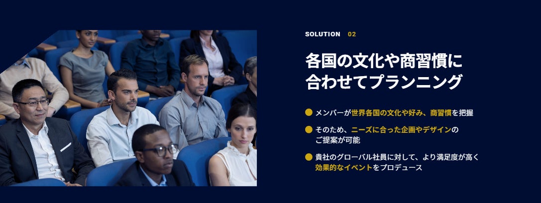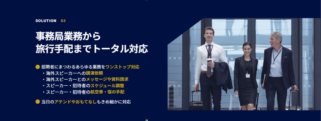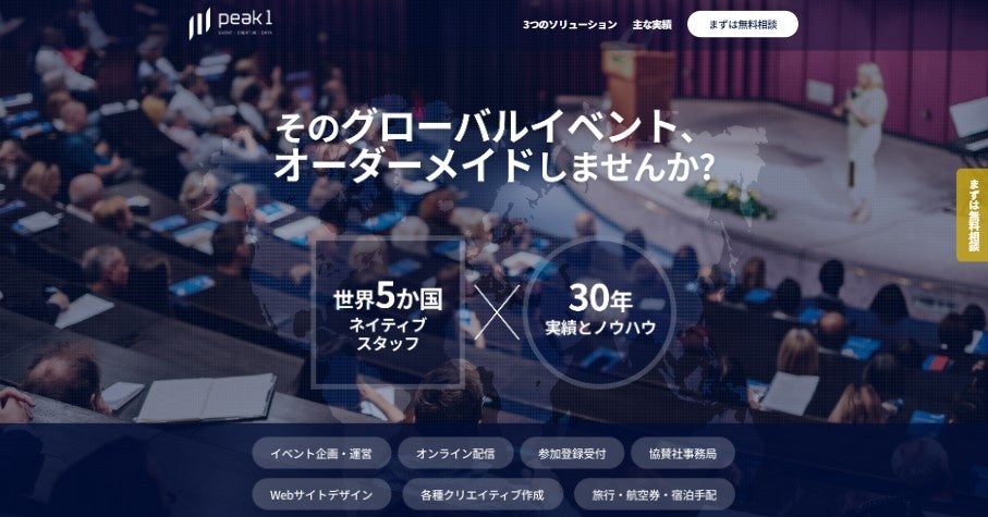 国内ならびに外資系企業・団体のマーケティングコミュニケーションを総合支援するプランニングエージェンシー「株式会社ピーク・ワン」はイベント業界で30年以上もの豊富な経験があります。ピーク・ワンには英語、日本語、中国語、韓国語、スペイン語の5つの言語に対応できるネイティブスタッフが在籍しており、各国の文化や商習慣に合わせた最適なイベント企画を提供することが可能です。新たにローンチしたランディングページでは、海外VIPの招致やインバウンドイベント運営のすべてを任せることができるトータルサポートについて詳しく紹介しています。
