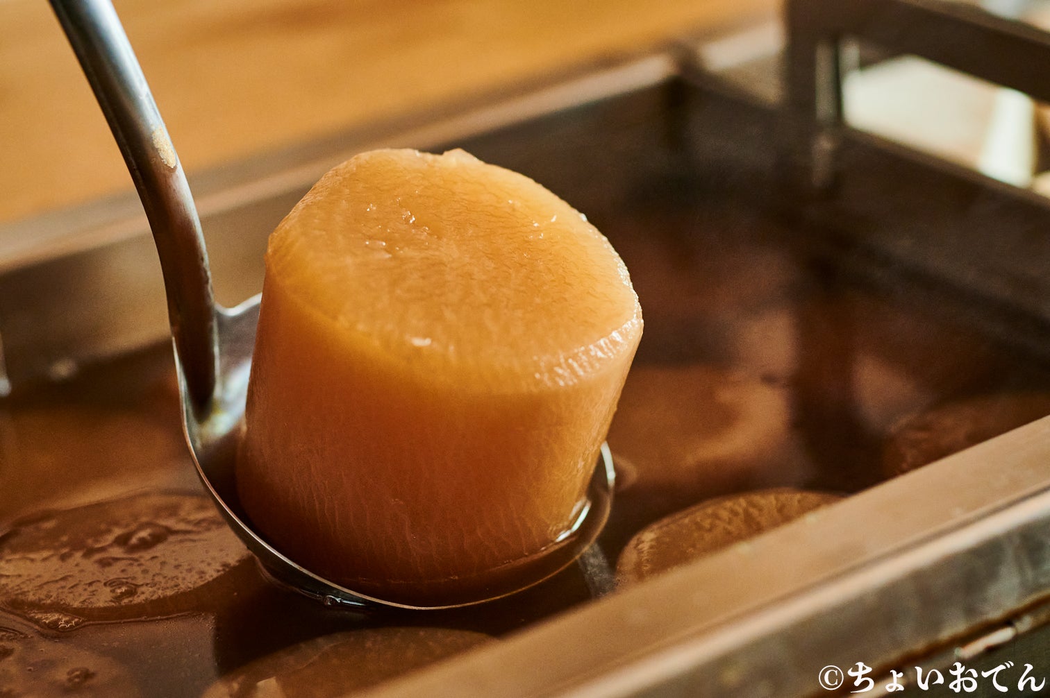 ちょいおでんの美味しさの秘密は、「究極の鱧(はも)出汁」です。高級食材である鱧の仕入れルートを確立し、安価に提供しています。醤油を使わない為、関東風、関西風、静岡風といった特定の地域の味ではなく、スッキリとした味わいながらも旨味の余韻が残り、どんな食材でも引き立たせることができます。