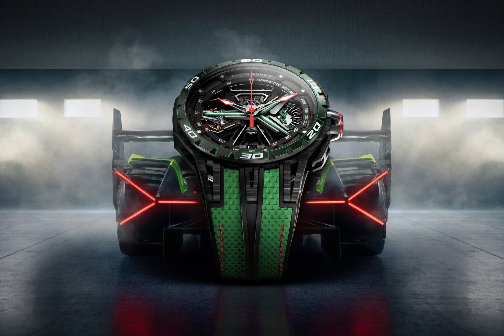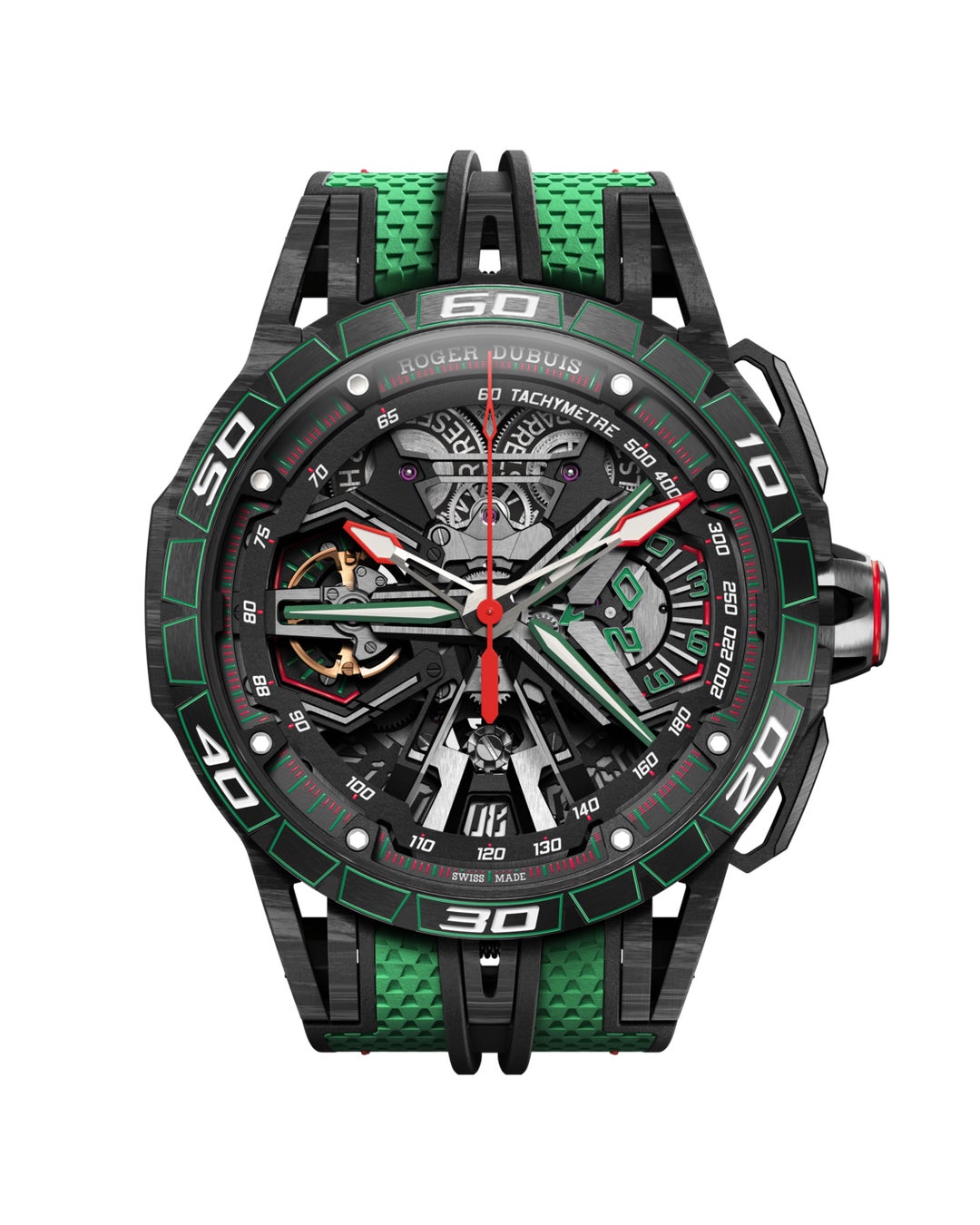 今年でレース参戦10周年を迎えるランボルギーニの次のステージは、モータースポーツの最高峰、ル・マン・デイトナ・hです。ロジェ・デュブイは45mmの新作タイムピースを車体の純正色と同色の鮮やかなグリーンで彩り、この瞬間を称えます。ヴェルデ・マンティスのトーンと完璧なバランスを織りなすグレーカラーのケースには、軽量カーボンを採用。ベゼルには高い耐傷性と耐変色性を誇るセラミックを採用し、日常使いにも最適なタイムピースが完成しました。