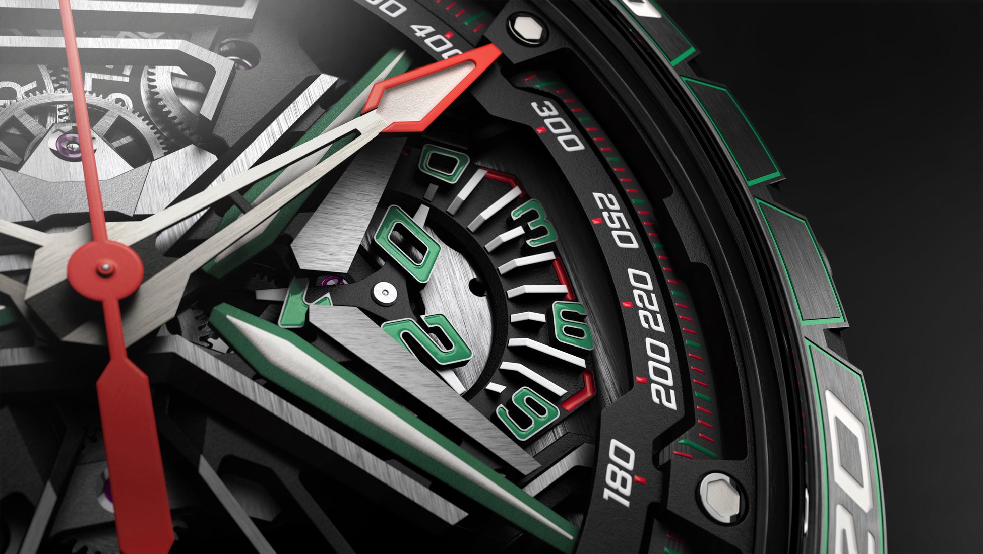 ケース径45㎜、自動巻き。C-SMCカーボンケース ブラックセラミックベゼルにラッカーマーキング、反射防止加工サファイアクリスタル、ブラックDLCチタンのサファイアクリスタル オープンケースバック、ブラックDLCチタンのリューズにレッドカラーリング。防水性10気圧。グリーンのラバーストラップ。ブラックDLCチタンのフォールディングバックル。16,775,000円(税込)