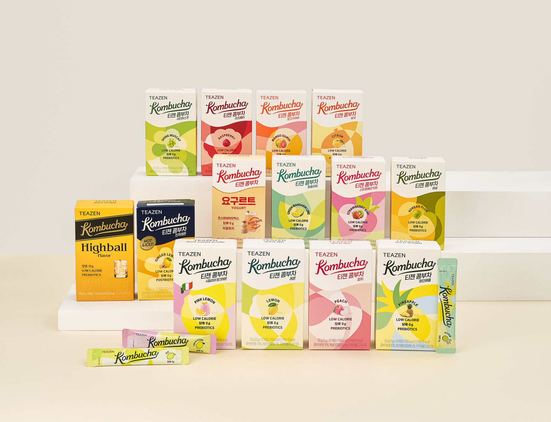 これまでTEAZENは、顧客ニーズを反映した継続的な商品開発を通じて、様々なフレーバーのコンブチャを市場に披露してきた。 現在、TEAZENはレモン、ピーチ、パイナップル、梅、ストロベリーキウイ、青みかんライムなど計16種類の粉末スティック型コンブチャ商品のラインナップを備えて、最近では100億乳酸菌を含めた「コンブチャヨーグルト」、ビタミンC配合の春限定として登場した自然原料を配合した春にぴったりピンク色のコンブチャ「シチリアピンクレモン」などを販売し、高好評を得ています。