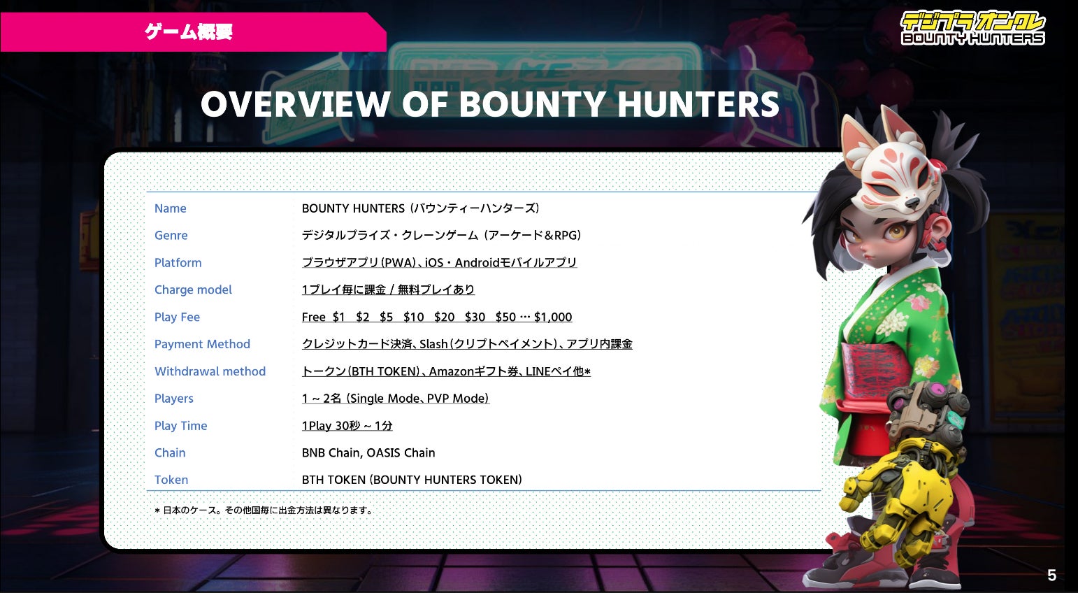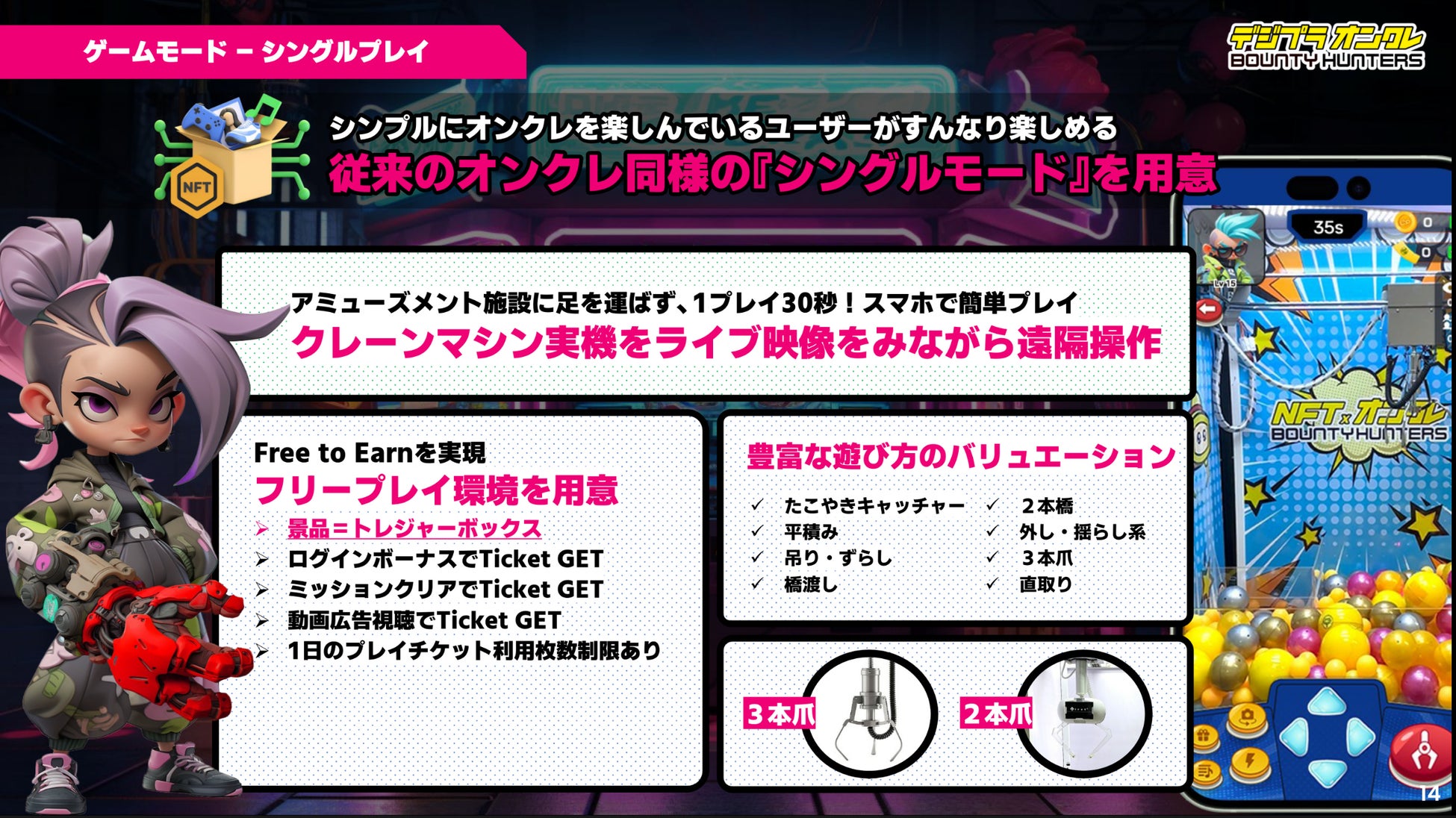 世界中での高い認知と、子どもから大人まで愛され続け100年以上の歴史があるクレーンゲームと言うキラーコンテンツにブロックチェーンを融合させたゲーム『BOUNTY HUNTERS』の公開、独自トークン『BTH TOKEN』の発行及び上場を2024年Q4に予定しています。