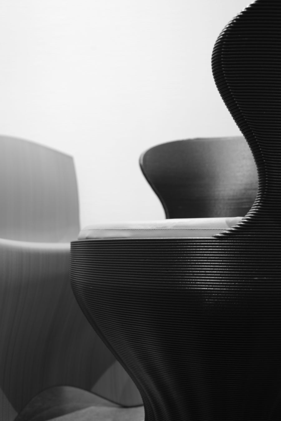 各社最新オフィスインテリアを展示する中でも、3Dプリンターで製作する孚美(FūūBi)のインテリアは、デザインや形状の自由度から、他社のインテリアとは違ったオフィス空間を作る事ができます。