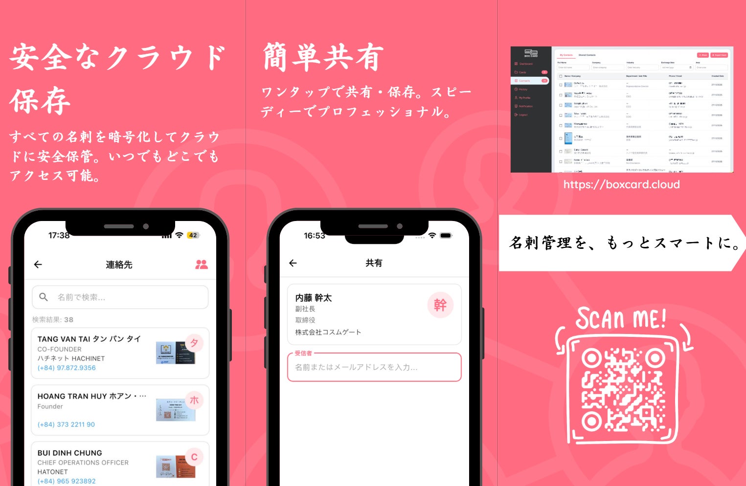 SUNNYDAY株式会社(以下、弊社)とHatonet有限責任ソフトウェア(以下、Hatonet)は以前より業務提携を行い、ベトナム国内トップレベルの高度な技術力・ITスキルを習得したベトナム人材の紹介・派遣事業を行ってきた。この度、Hatonetの事務所内にSUNNYDAY株式会社が「CÔNG TY TNHH SUNNYDAY VIETNAM」を設立し、Product Manager, Sales, and Marketingを育成する事を決定。両社がベトナム社会主義共和国内及び日本国内において共同体として事業を進める嚆矢として、「Boxcard」を第一弾としてリリースする。日本国内における、名刺アプリ「Boxcard」はSUNNYDAY株式会社の独占販売。11月26日(水)と11月27日(木)、両日に東京ビッグサイト東6ホールにて開催される「ビジネスチャンスEXPO in TOKYO」にてユーザーに初披露する。