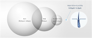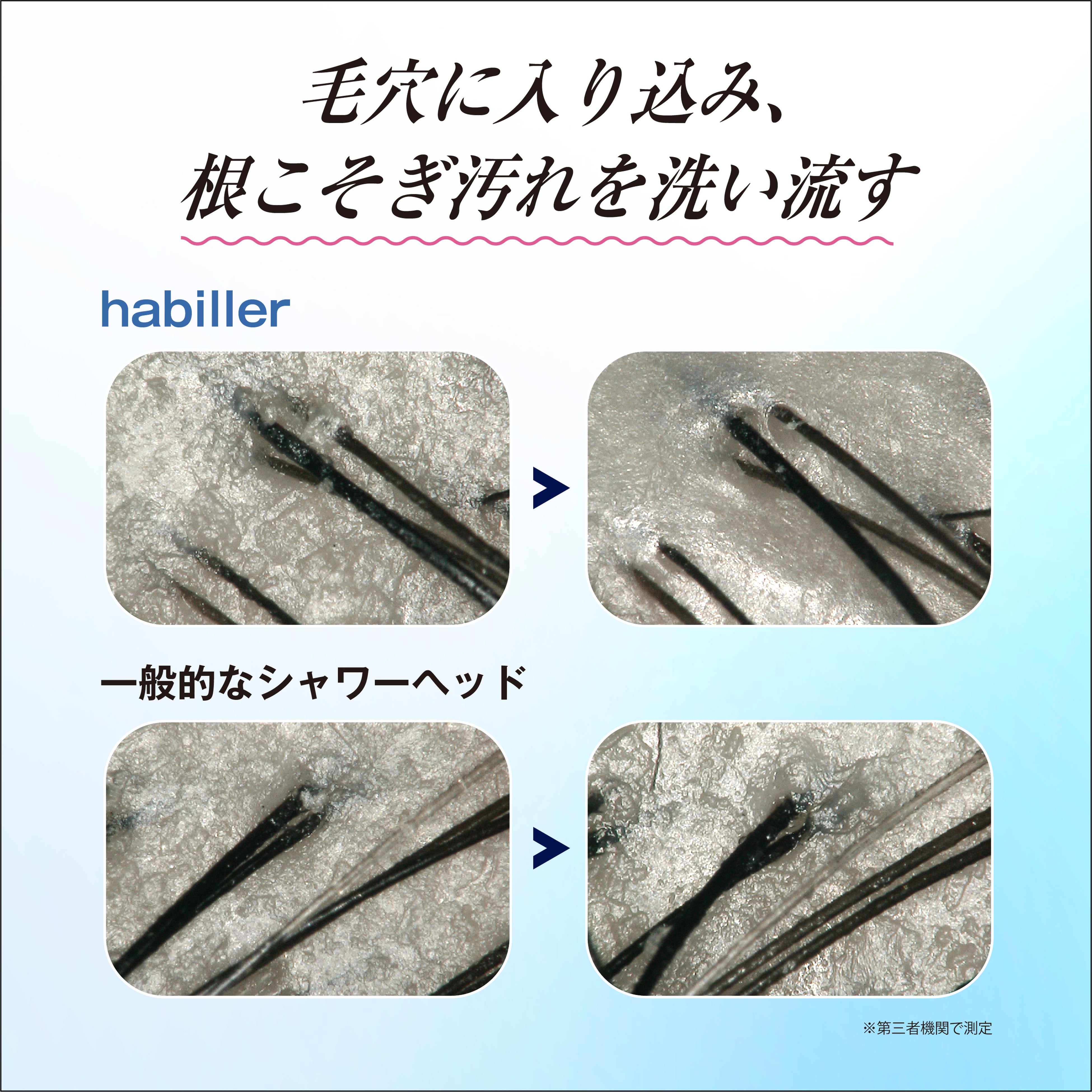 「ウルトラファインバブル」はファインバブルよりも小さい直径1μm未満の泡のことで、 habillerはさらに小さい0.1μm前後の気泡サイズを実現しました。これにより毛穴の奥にも入り込むことができ、髪と肌にうるおいを与えながら、水だけで匂いの原因や余分な皮脂や汚れを落とします。毎分最大12Lの水量でたっぷりとウルトラファインバブルを浴びられるので、シャワー後も温かさが持続します。