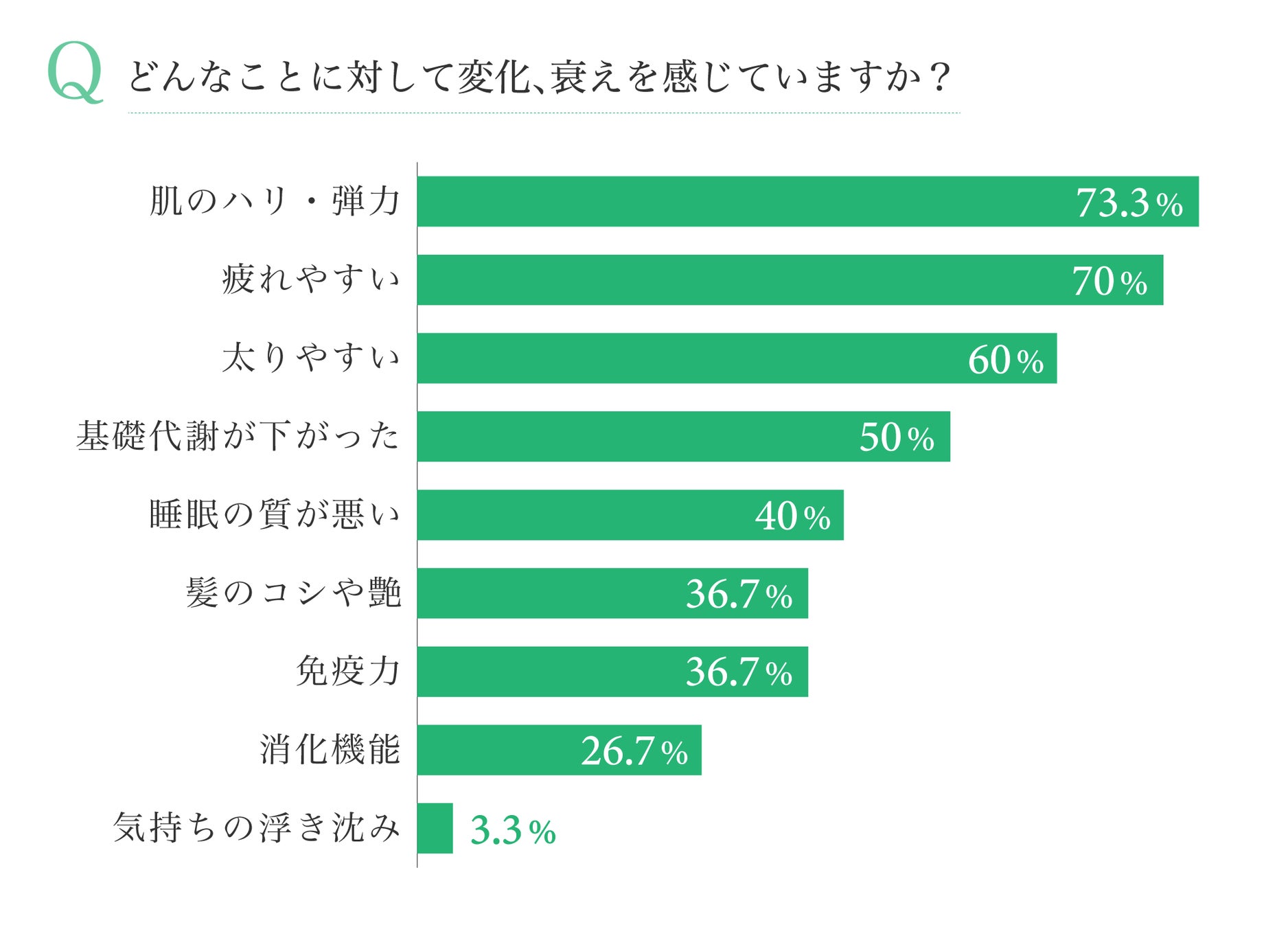 その変化について詳しく聞いてみると、もっとも多かったのは、「肌のハリ・弾力」(73.3%)。そのほか「疲れやすい」(70%)「太りやすい」(60%)「基礎代謝が下がった」(50%)といった回答が上位に上がりました。美容や体力維持の面で大きな悩みが生まれていることがわかります。