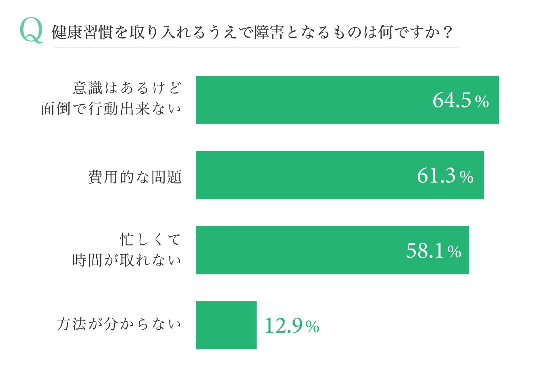 「どのようなことが障害になっているか?」という質問に対しては、「意識はあるけれど、面倒で行動できない」(64.5%)「費用的な問題」(61.3%)「時間がない」(58.1%)といった回答が大半を占めました。どうやら忙しい日々を過ごす女性にとっては、いかに低いハードルで健康づくりにとりくめるか、が重要なようです。