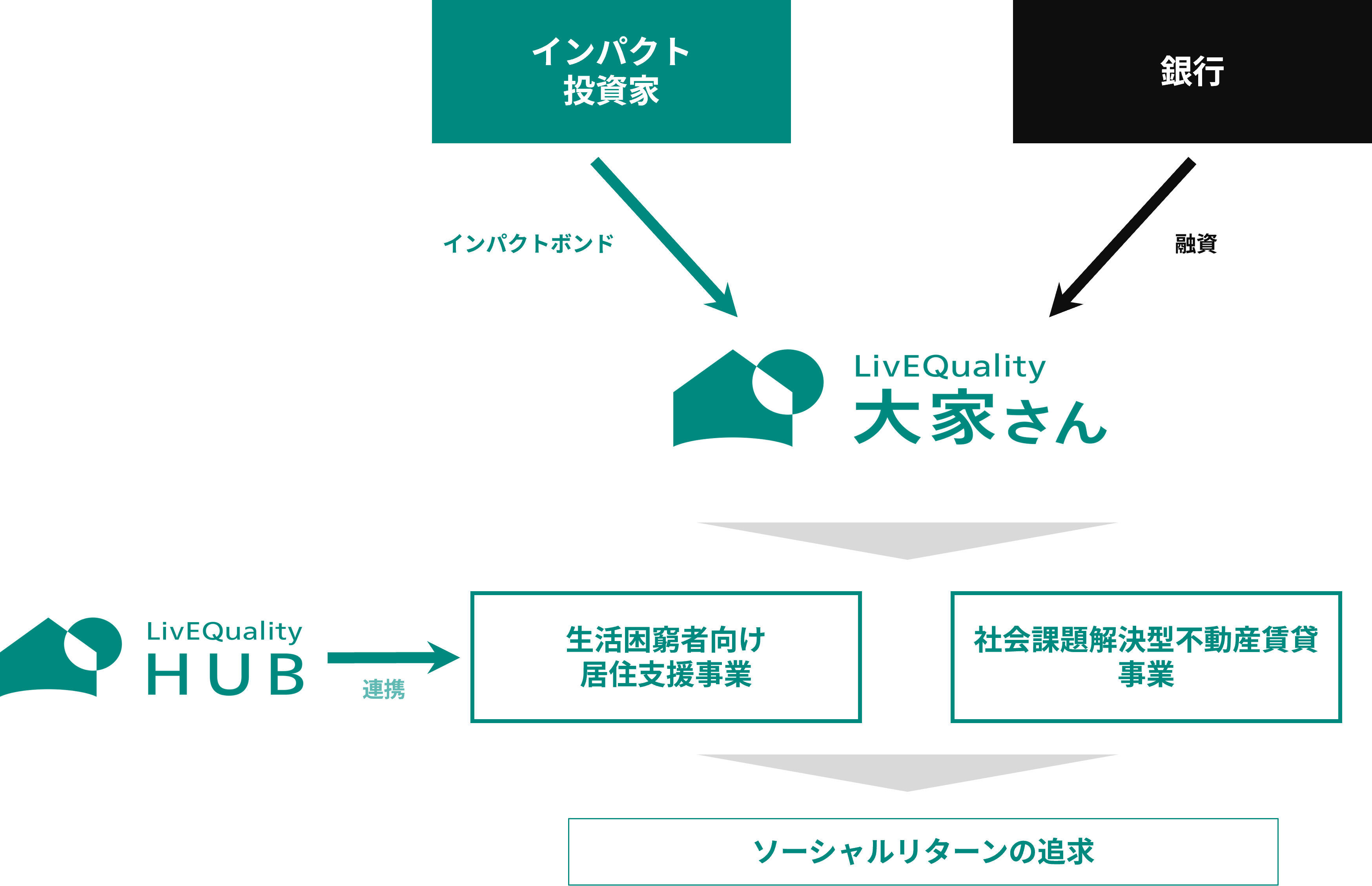 インパクトボンドは、LivEQuality大家さん、NPO法人LivEQuality HUBおよびインパクト投資家を含む様々なステークホルダーが一体となって行うLivEQuality事業に関連して、アフォーダブルハウジングに活用する住宅の取得のための資金調達として発行されます。