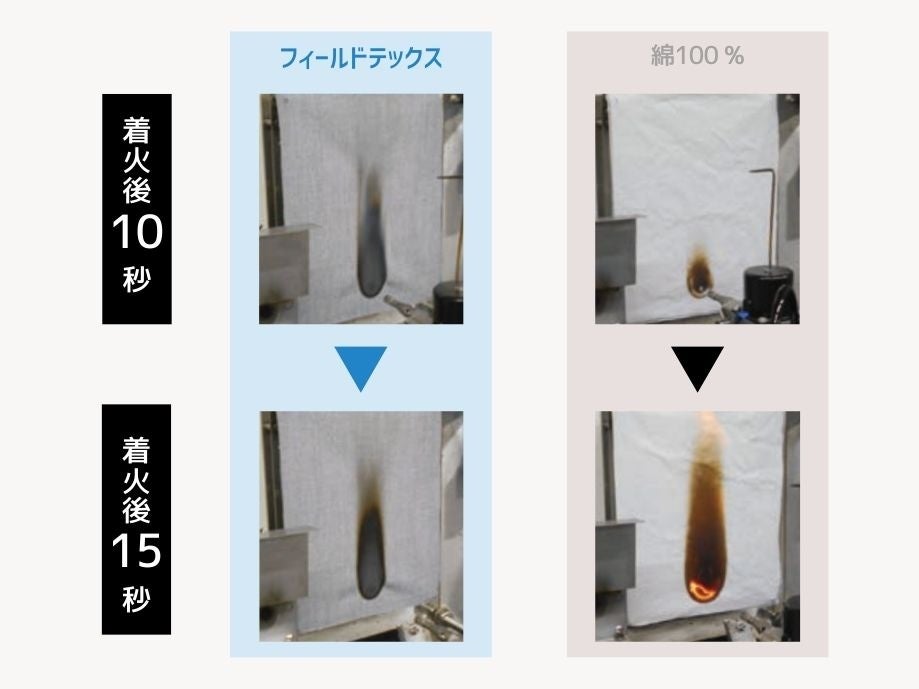 一般的な綿100%素材は着火後15秒で炎に包まれますが、FIELDTEX®は燃え広がりません。