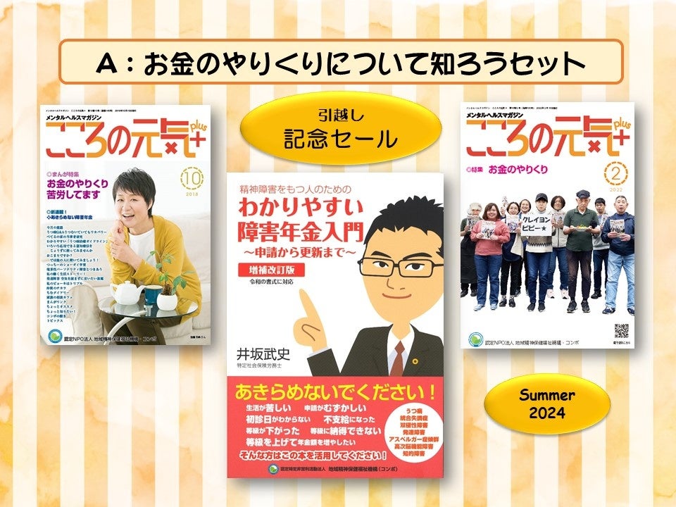 NPO法人コンボでは、この夏の事務局移転を記念して、期間限定で書籍DVD等の割引セールを開催中です。メンタルヘルスのサービスユーザーに関心の高いテーマを5つ選び、A~Eの5セットをご用意いたしました。期間は8/30まで。税込価格から通常の3割引きになっています。興味のあるテーマについて、この機会にまとめてお求めください!