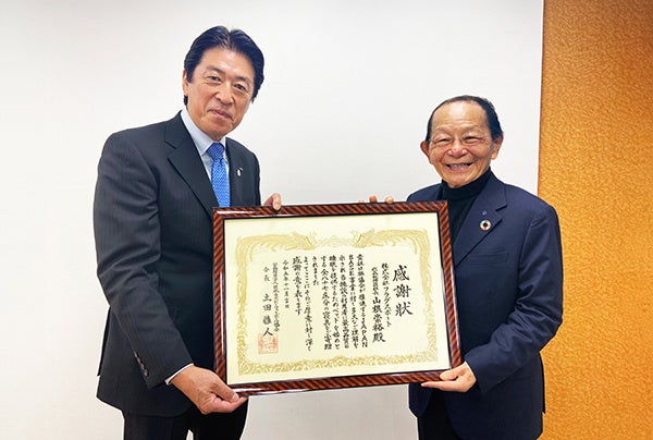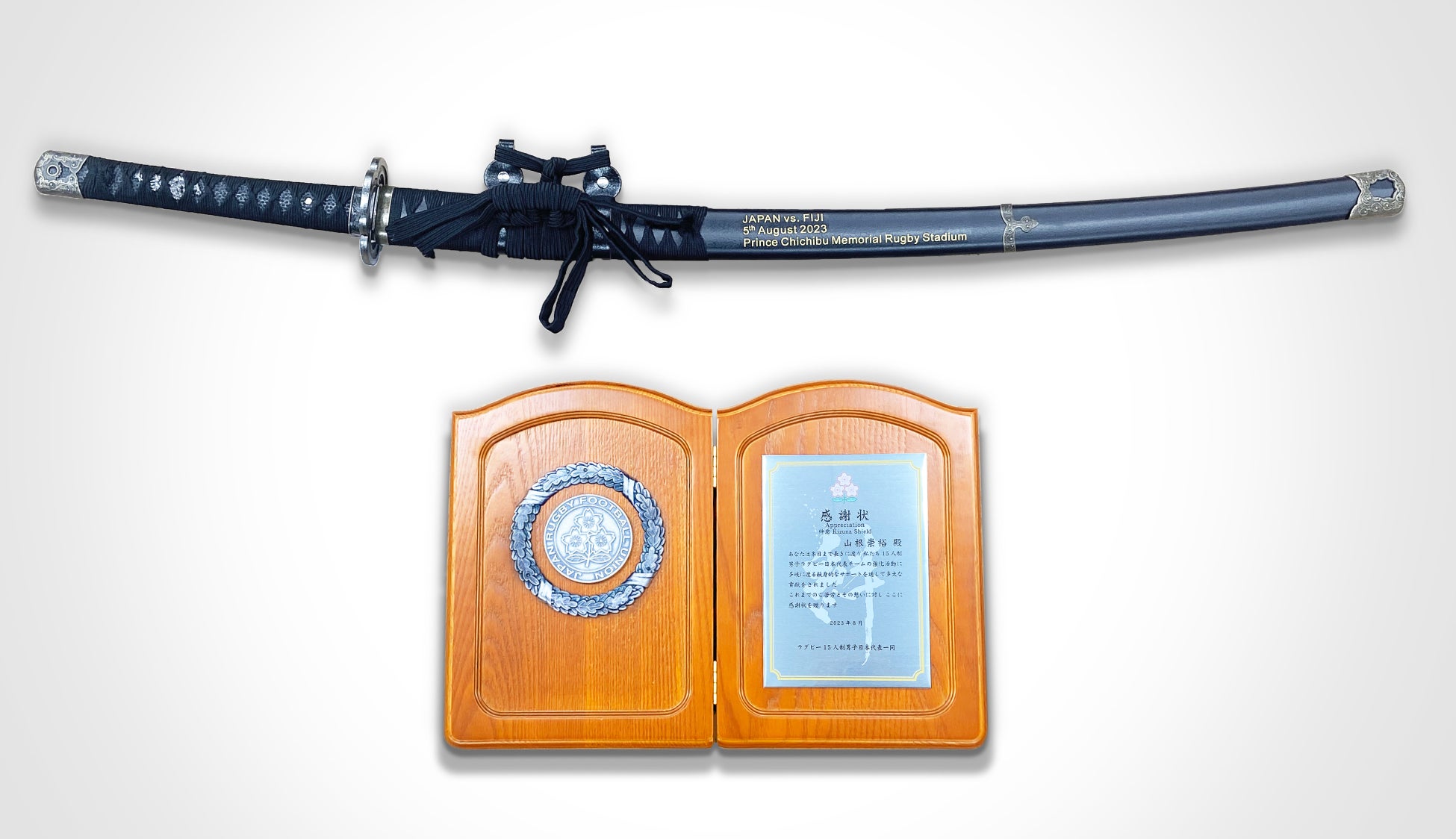 JAPAN BASE事業への深い理解と、日本ラグビーへの貢献が認められ、2023年12月13日に代表取締役社長 山根崇裕は、日本ラグビーフットボール協会 土田雅人会長より、感謝状を贈呈されました。また、遡ること8月5日には、チームからは記念の刀と盾も贈呈されました。