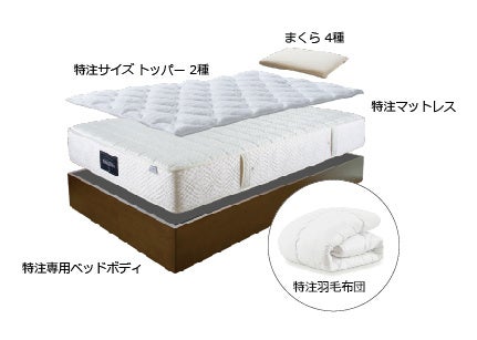 ラグビー選手が快適にリカバリーを行えるよう、マットレスはイタリアの工場へ 幅120×長さ210×厚み26cm の特注サイズで手配。長身選手でも寛げるロング仕様になっています。そのマットレスと合わせる形で、寝心地を更にアップさせ保護効果も高い上敷きトッパーを同サイズで2種特注し、さらに屈強なアスリートの使用にも耐えられる頑強な木製ベッドフレームを同じく特注で制作しました。その上には吸湿性と肌触りに優れたガーゼ・脱脂綿素材のケットと、多くのプロアスリートのモニタリングテストを重ねて製品化された特注の羽毛布団が揃います。まくらも計4種類を用意し、選手の体型や好みに合わせて最適なものを選ぶことが可能になっています。