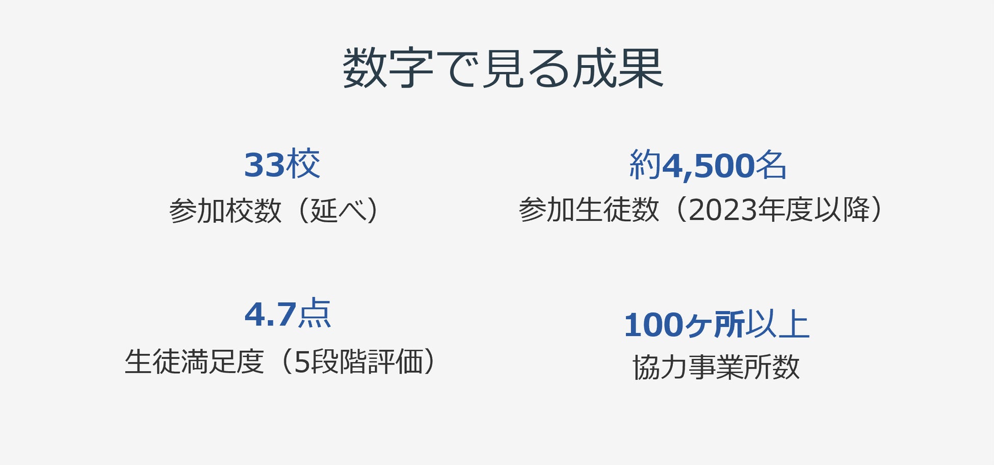 参加後のアンケートでは、生徒から平均4.7点(5段階評価)という高い満足度が寄せられています。