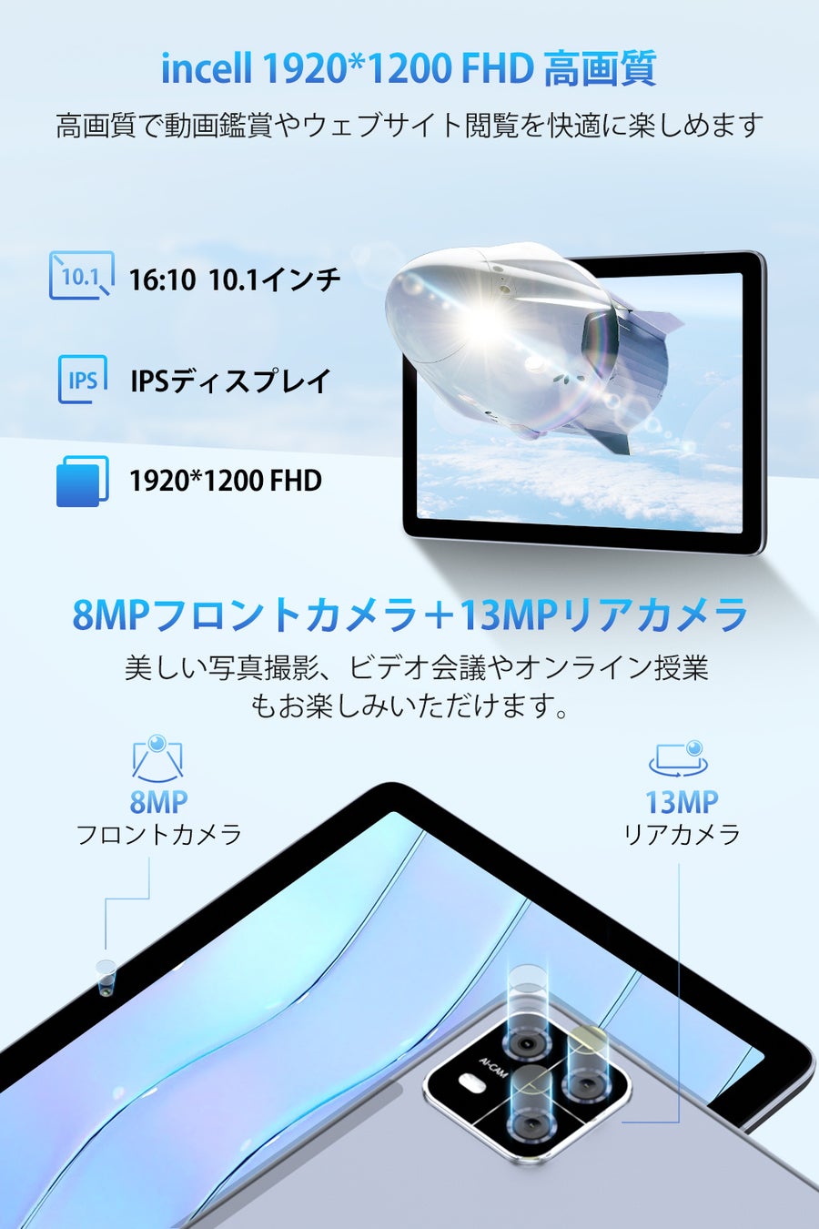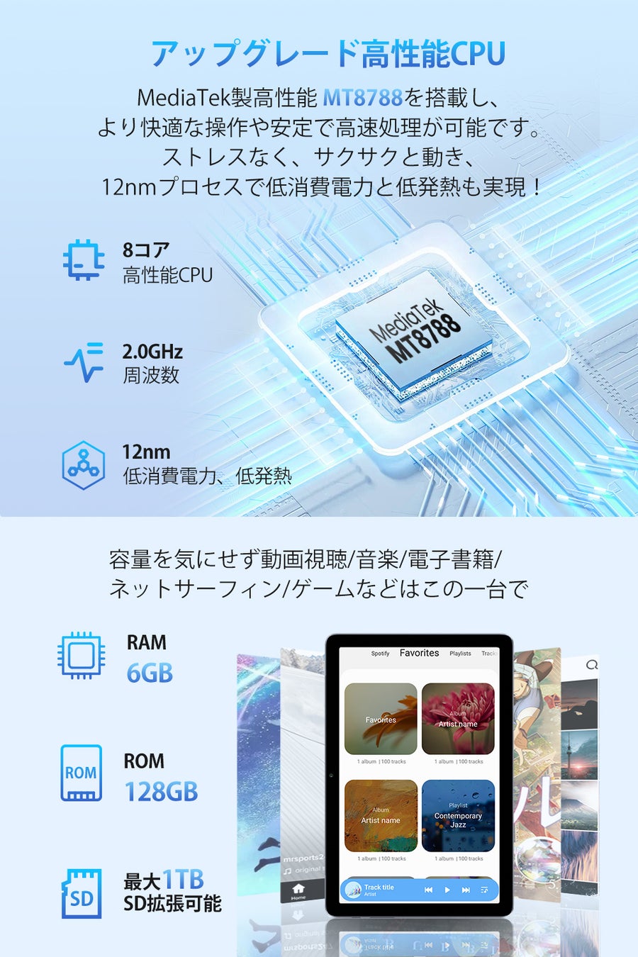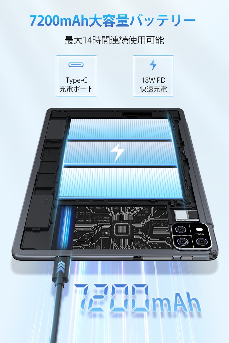 MediaTek MT8788パワフルな8コア高速処理チップ/10.1インチ大画面/Incell 1920*1200のフルHD画質/7200mAhの大容量バッテリー/18W USB-PD急速充電