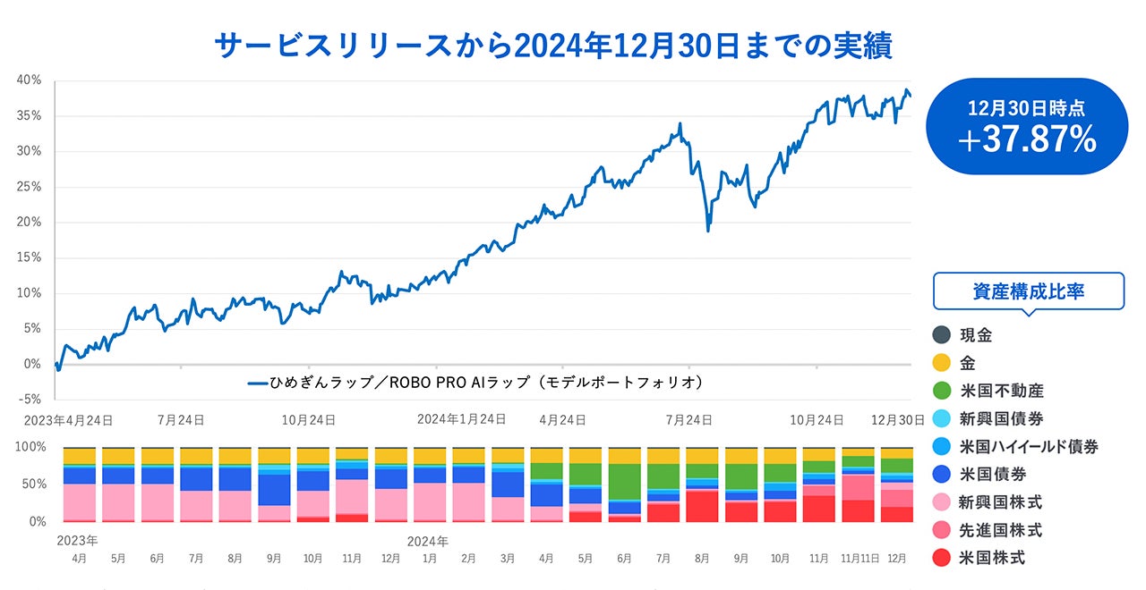 ※グラフが示す「ひめぎんラップ/ROBO PRO AIラップ」の運用実績は、サービス開始当初(2023年4月24日)から2024年12月30日まで、本サービスに投資していた場合の運用実績です。リバランスは最適ポートフォリオとの乖離がないように実施したと仮定し、分配金は投資の拠出金銭に自動的に組み入れ、リバランスにより再投資したと仮定して計算しています。分配金やリバランス時の譲渡益にかかる税金は考慮していません。計算期間開始日から2024年12月30日までの投資対象ファンドの基準価額(信託報酬やその他の費用、投資対象ファンドを通じて保有するETFの分配金が考慮されています。)をもとに、最大の運用手数料1.98%(年率、税込)を考慮のうえ、「(計算期間終了日時価/計算期間開始日時価)-1」で計算した値を%で表示しています。表示している割合は年率ではありません。計算後の数値の小数第3位以下を切り捨てて表示しています。