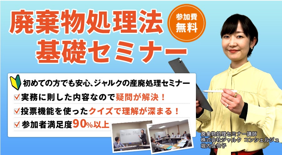 大阪堺筋本町に本社を構える株式会社ジャルクは、11月14日(木)に「廃棄物処理法基礎セミナー」を無料オンラインにて開催する。