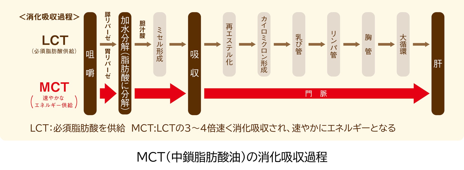 MCT(中鎖脂肪酸油)はココナッツ油やパーム核油に含まれる成分です。一般的な油よりもすばやく分解・吸収されてエネルギーになりやすい特徴があります。