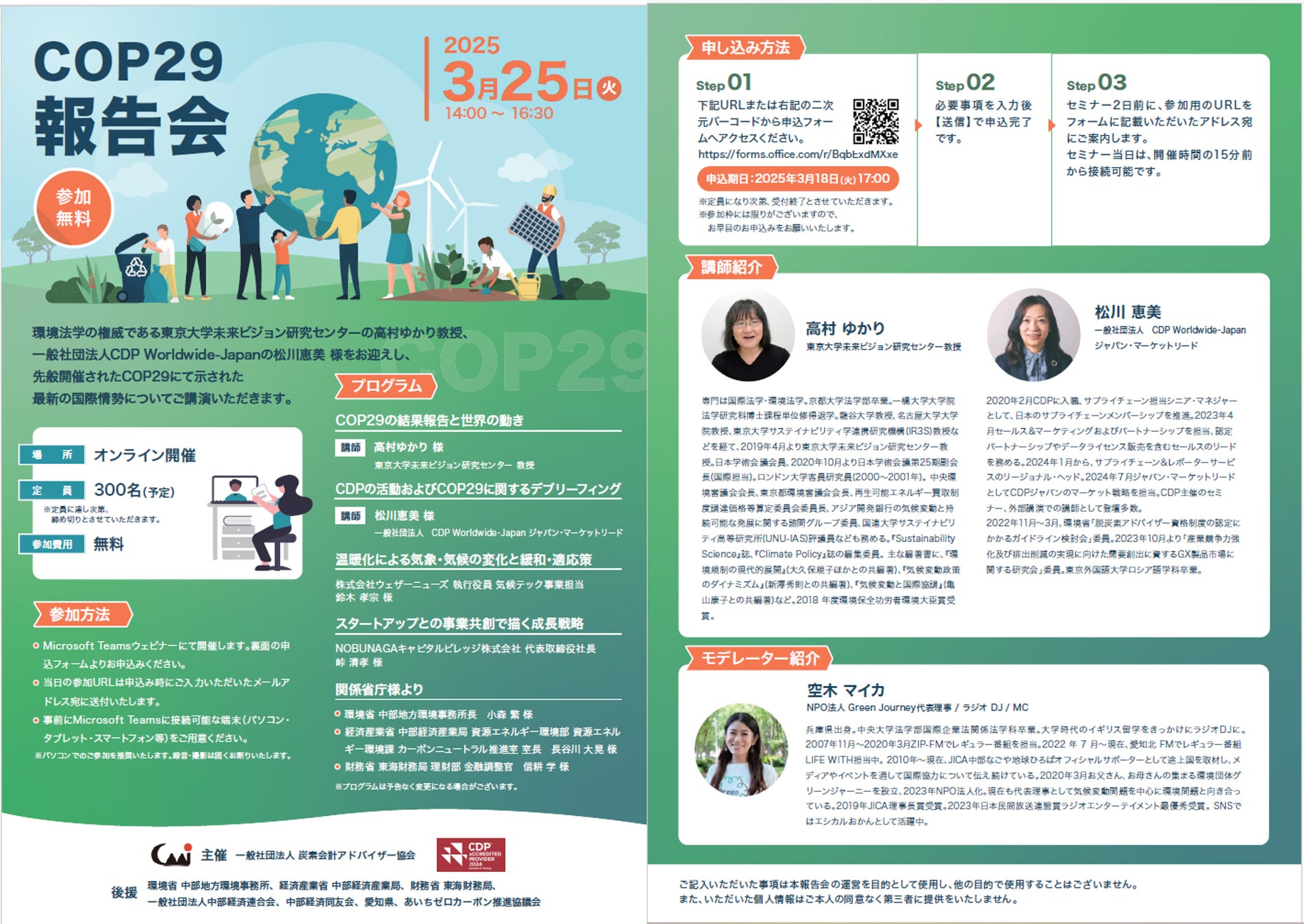 環境法学の権威である東京大学未来ビジョン研究センターの高村ゆかり教授、一般社団法人CDP Worldwide-Japanの松川恵美様をお迎えし、先般開催されたCOP29にて示された最新の国際情勢、および国内外におけるカーボンニュートラル取り組みや脱炭素経営の進め方等についてご講演いただきます。