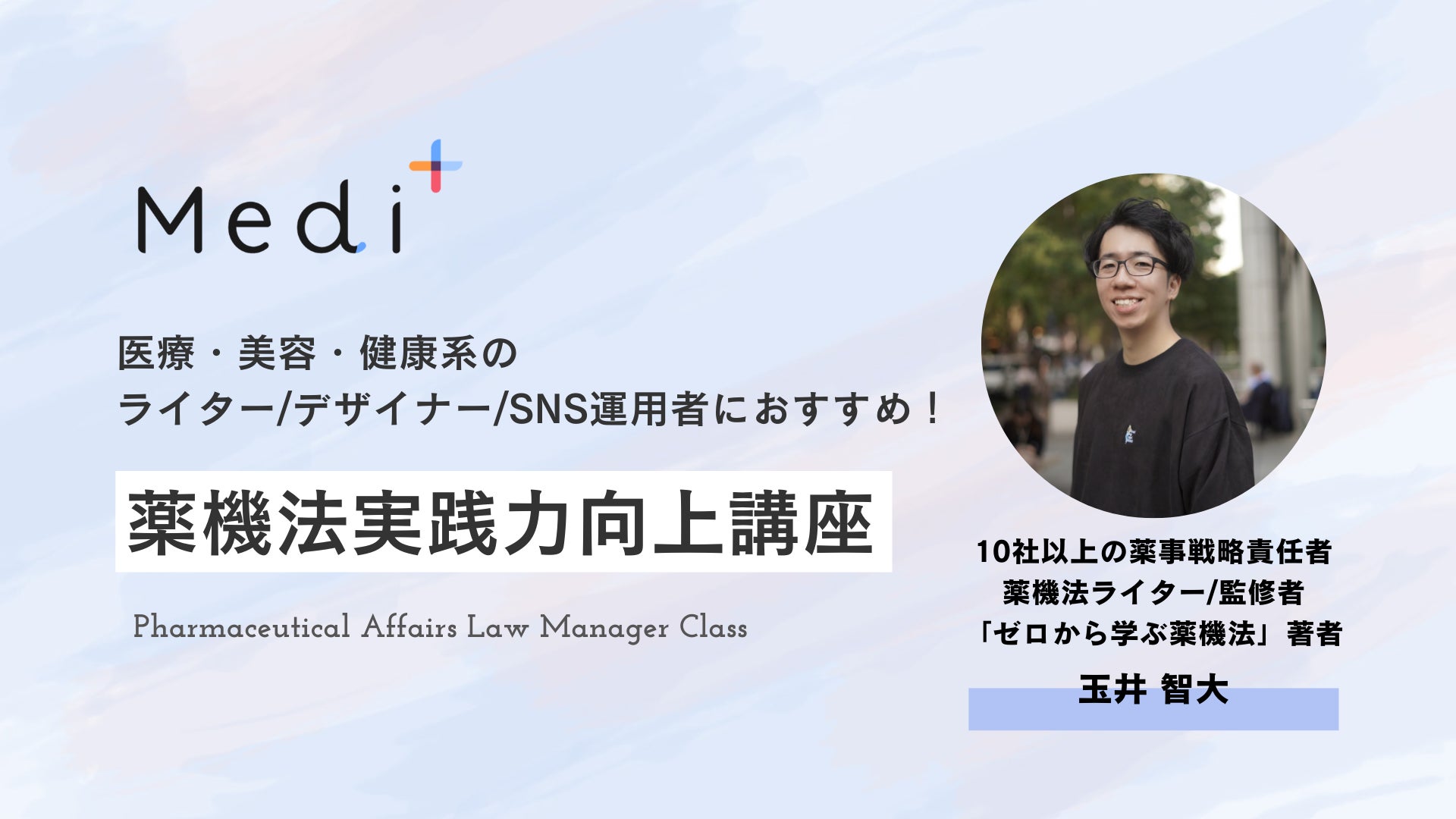 薬機法自体は無料で学ぶことができます。 しかし、理解することは簡単ではなく、微妙な表現の違いでOK/NGと判断されてしまう難しさがあります。そのため、一から学べる、悩んだときに相談できる場所が欲しいという声を多く聞いてきました。 Medi+薬機法実践力向上講座では、法律・ガイドラインをただ説明するのではなく、考え方やOK/NG例を解説しながら、過去私が対応した案件を真似た模擬課題を通じて、卒業後活躍できる力を身につけることを目的としたカリキュラムになっています。 薬機法が関わる相談を受ける方、これからチャレンジしていきたい方、より実践力を高めていきたい方などにとって学びになれれば幸いです。