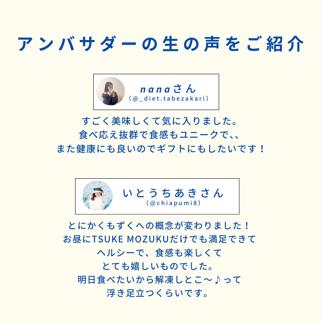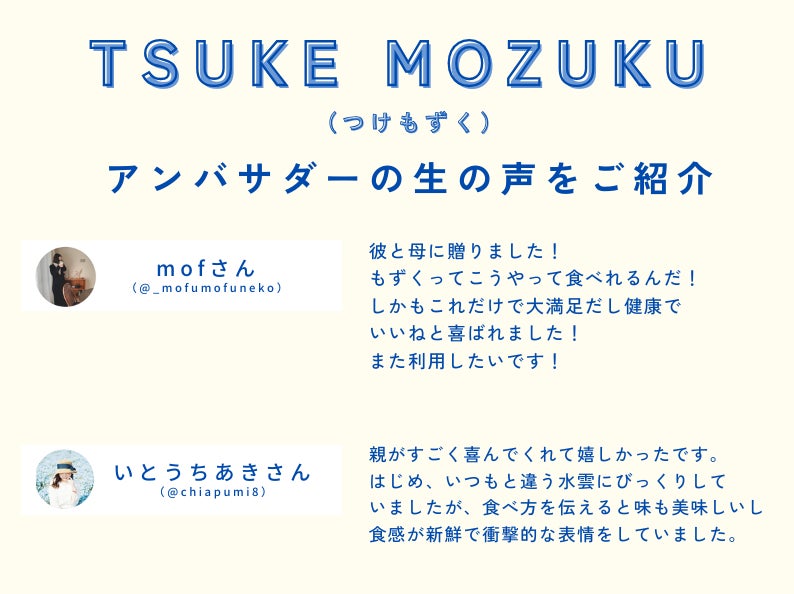 「TSUKE MOZUKU」の魅力を広めていただくために、アンバサダーの方々にご活動いただきました。今回のアンケートでは、商品の魅力や改善点について率直なご意見を伺いました。
