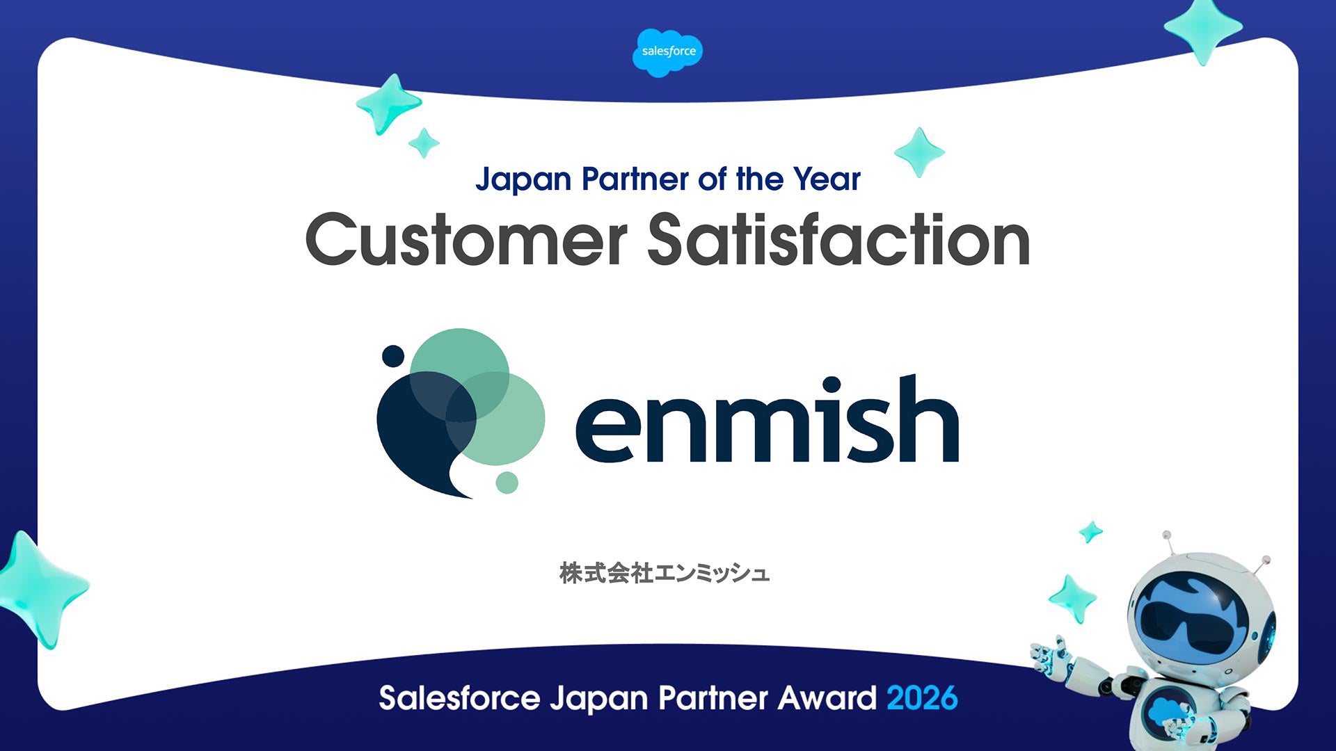 株式会社エンミッシュは、Salesforce Japan Partner Award 2026におけるJapan Partner of the Year – Customer Satisfactionを受賞しました。
