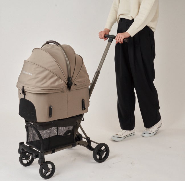 新モデル『WIZ X(ウィズエックス)』は、ユーザーからの感想や意見をもとに走行性と機能をさらにブラッシュアップ。普段のお散歩やお買い物、通院などに使いやすい、ペットカート初心者にぴったり寄り添う“相棒”のようなコンパクトカートに仕上げました。