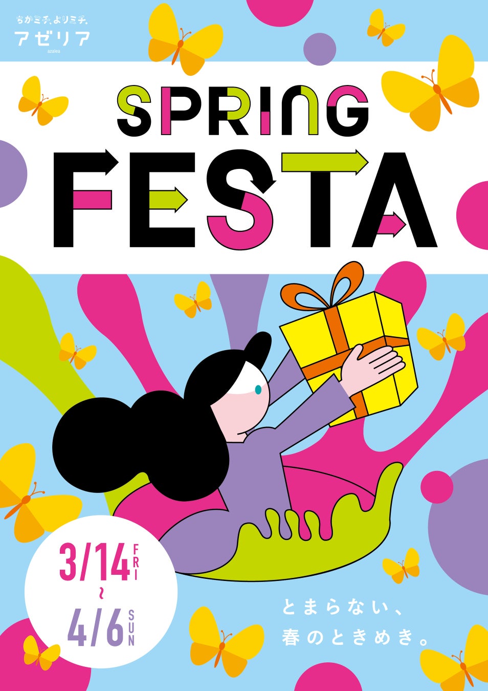 期間中、対象店舗にて、お得にお買い物ができるSPRING FESTAを開催いたします。詳細情報は館内ポスターや店頭POP、アゼリアHPにて掲載いたします。