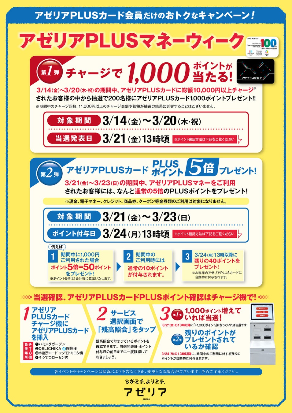 アゼリアでのお買い物が便利でおトクになる「アゼリアPLUSカード」をお持ちの方に、さらにおトクになるアゼリアPLUSマネーウィークを開催いたします。