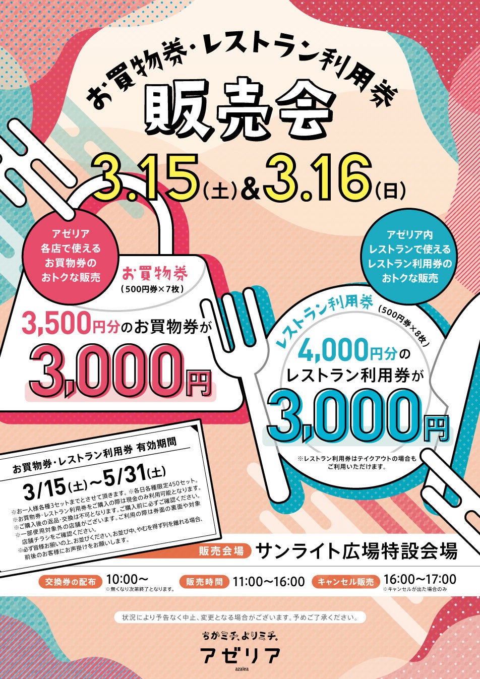 アゼリア内各店で使えるお買物券と、アゼリア内レストラン店舗で使えるレストラン利用券のお得な販売会を実施いたします。お買物券は3,500円分を3,000円で、レストラン利用券は4,000円分を3,000円で購入することができ、購入当日から2025年5月31日(土)までご使用いただけます。