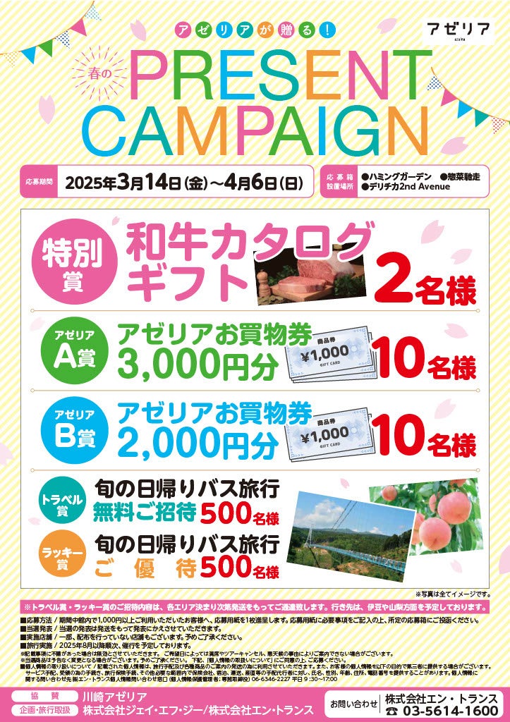 期間中、1,000円以上お買物・お食事をしていただいた方に、店舗で応募用紙を差し上げます。抽選で、ギフトカタログ、アゼリアお買物券やバス旅行ご招待をプレゼントするキャンペーンが開催されます。是非この春、川崎アゼリアへご来館いただき、azalea SPRINGをお楽しみください。