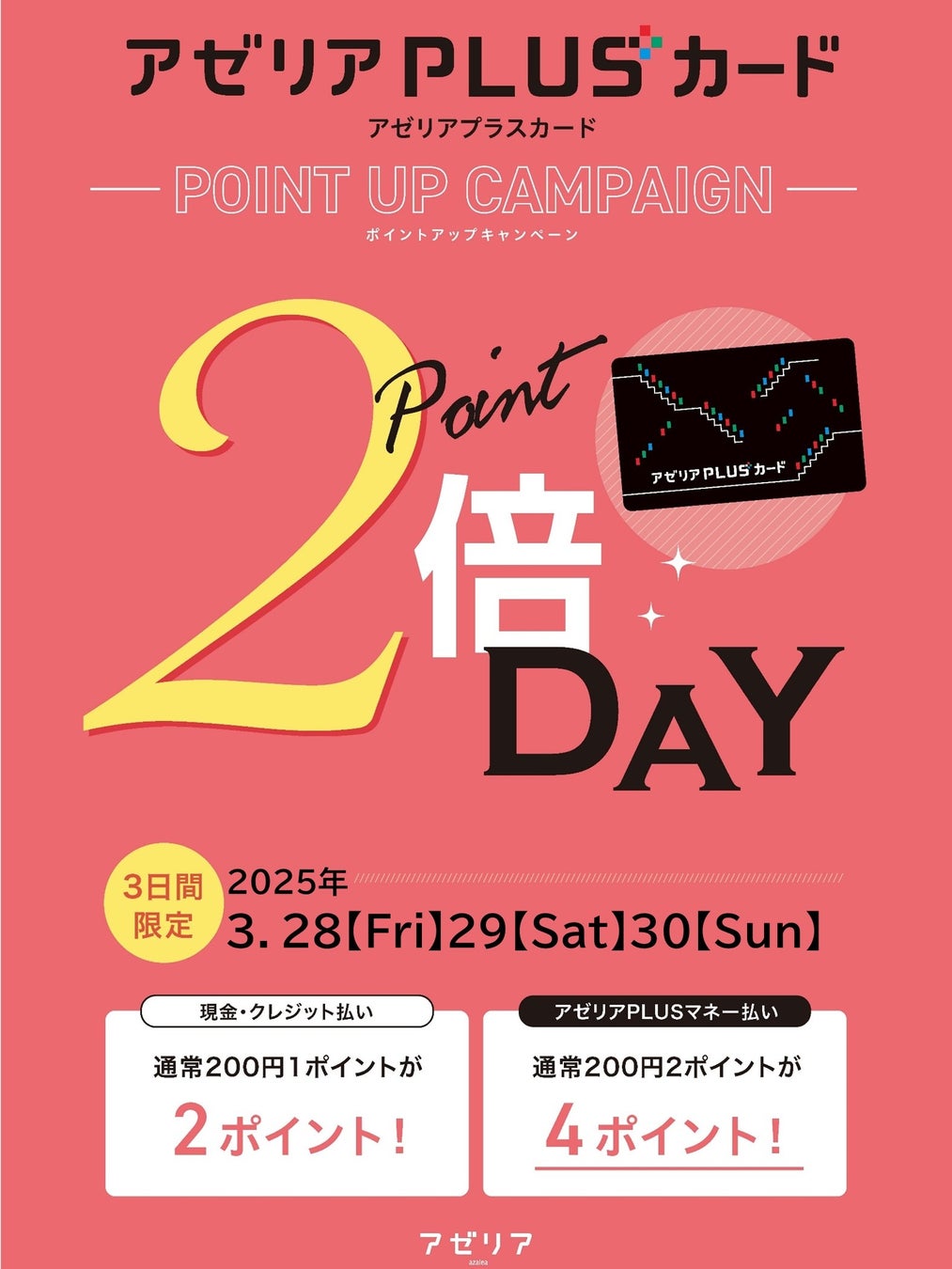 アゼリアPLUSカードポイントが通常の2倍付与されるポイントアップキャンペーンを開催いたします。