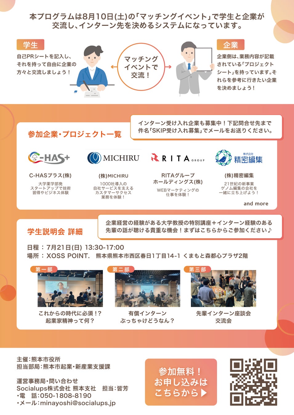Socialups株式会社は、熊本市より事業採択を受け、起業家育成インターンシップ支援事業としてStartup Kumamoto Internship Program (通称SKIP)を実施致します。