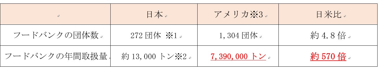 一方、アメリカのフードバンクの年間食品取扱量は739万トンで、これは国内の食品ロス発生量(472万トン)より多く、国内フードバンク取扱量の570倍に相当します。このように、アメリカではフードバンクが膨大な量の食品ロス削減と、経済的な困難を抱える世帯への食料供給に大きく貢献しています。