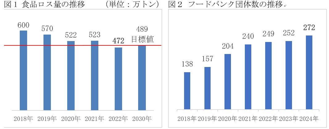 2024年6月21日、政府は2022年度の食品ロス量が472万トンという最新の数値を発表し、前年度(2021年度)の523万トンを大きく下回り、2030年までの政府削減目標値(489万トン)を8年前倒しで達成したことを公表しました(図1)。また、農林水産省ホームページの「フードバンク活動団体一覧」に掲載がある通り、2024年5月時点でフードバンク団体数は272団体に拡大しました(図2)。