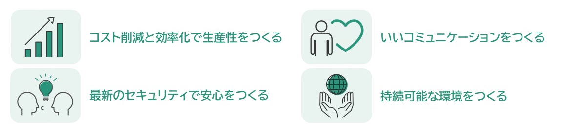 企業様のオフィス構築や提案において「4つのつくる」を重視しており、それが私たちの最大の強みとなっています。企業様が効率的かつ生産的に働くための最適な環境を提供することに重点を置いています。コスト削減・生産性向上・セキュリティー強化・バックアップ対策・BCP対策・持続可能な環境といったお客様のあらゆる課題に応え、最適なオフィス環境を創造します。