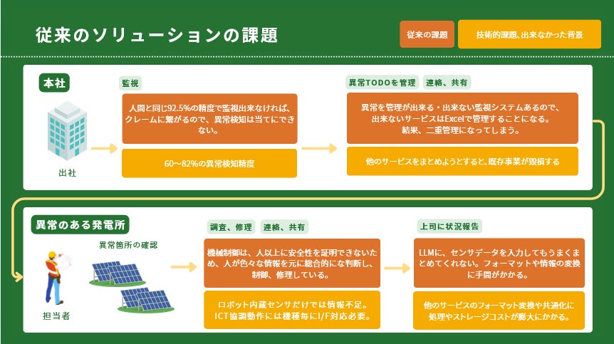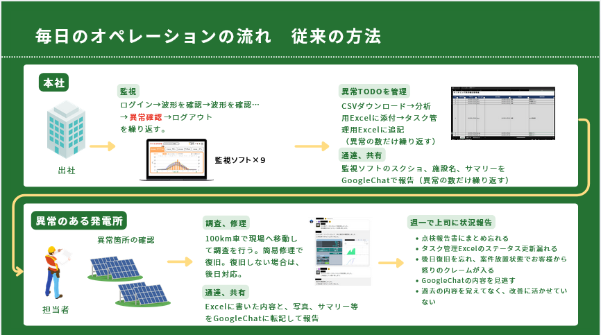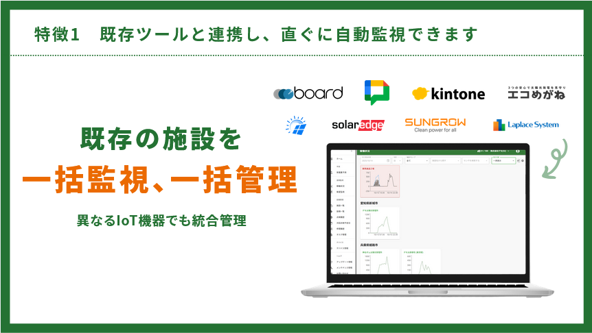 1994年「住宅用太陽光発電導入促進事業」がスタートし、2012年の再エネ特措法で「固定価格買取制度(FIT)」が開始されたことにより、太陽光発電は爆発的な成長を遂げてきました。この市場拡大の流れの中で、複数の発電所を保有する事業者や、メンテナンス等を行う事業者にとって、発電所ごとの遠隔監視が必要な状況に至っています。また、年代ごとにトレンドのあるシステムも存在しているので、発電所ごとに監視システムが異なっているというケースも多く、遠隔監視体制が発電所数に比例した労働集約型作業になっております。1500ヶ所の管理を2名体制で行っており、月間100万円以上の管理コストがかかっているケースもあります。Nobest IoTは複数の発電所を一元管理できるシステムのため、24時間体制で監視しながら複数の発電所を担当者1名で運用することが可能となります。