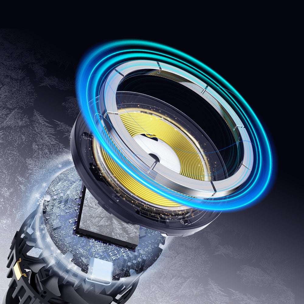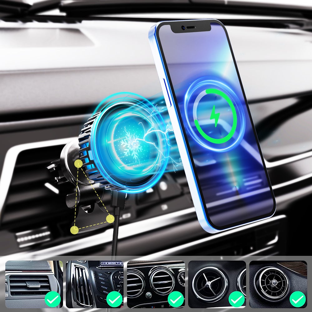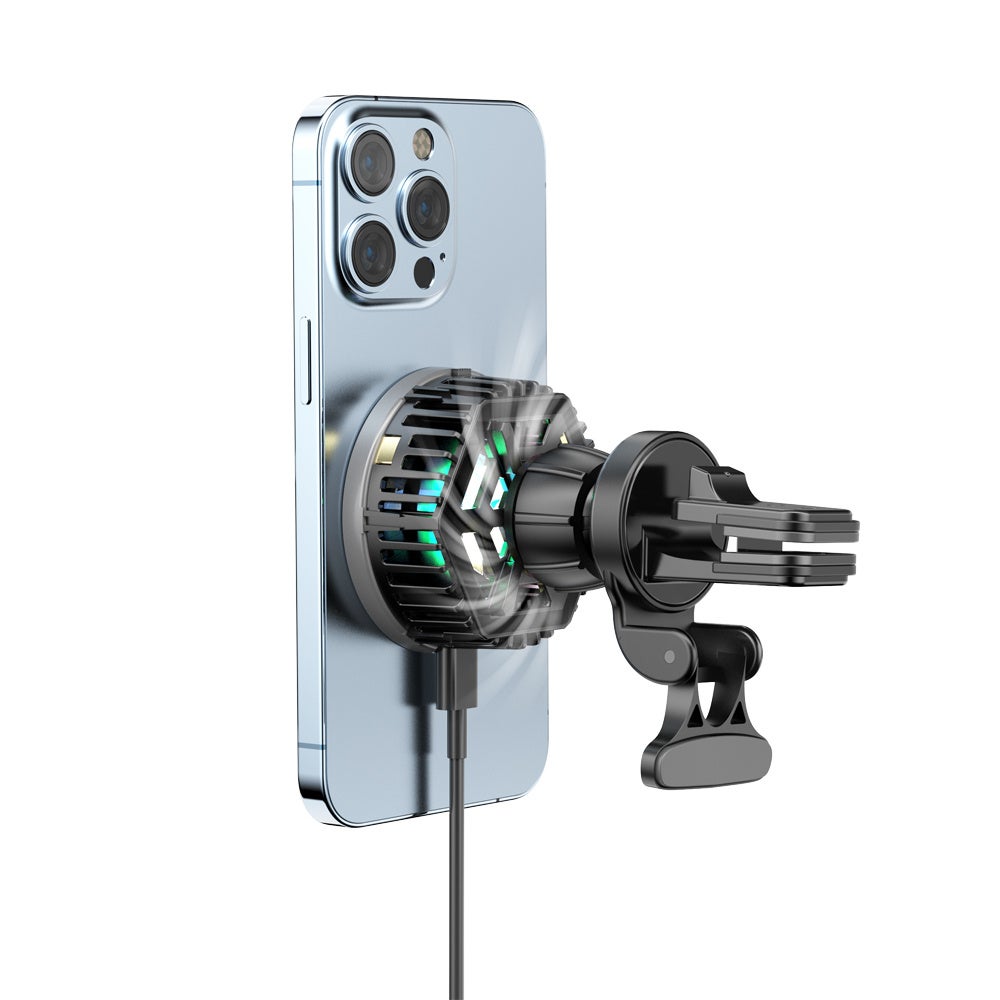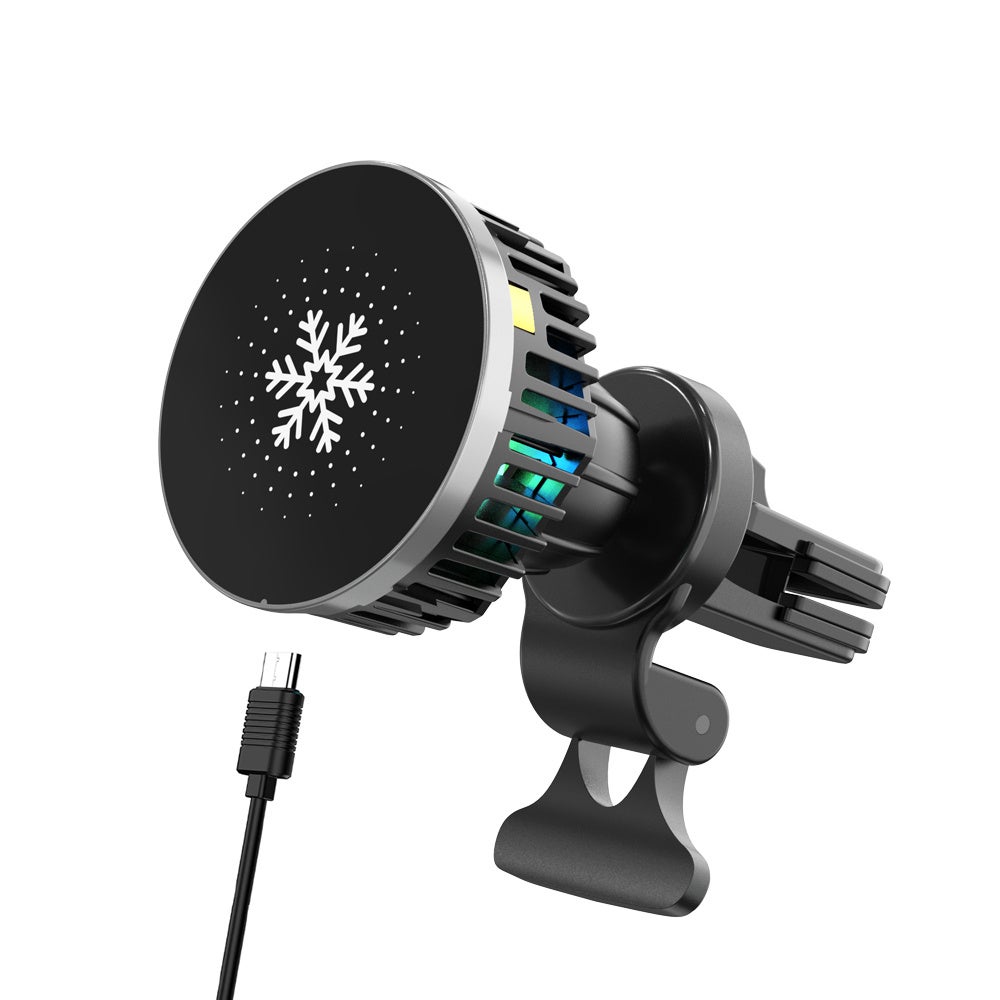 チャージャー内の半導体冷却チップと冷却ファンが、端末だけでなく充電器自体の熱暴走を防ぎ、充電効率を上げる最新型の急速ワイヤレス充電対応のカーマウント。