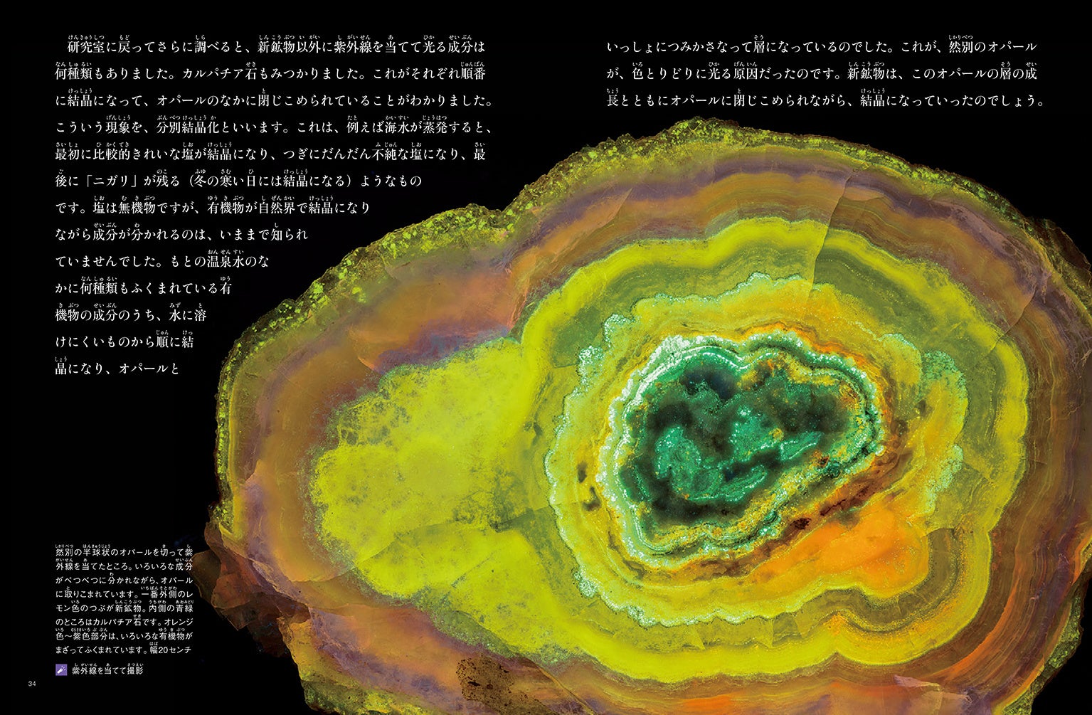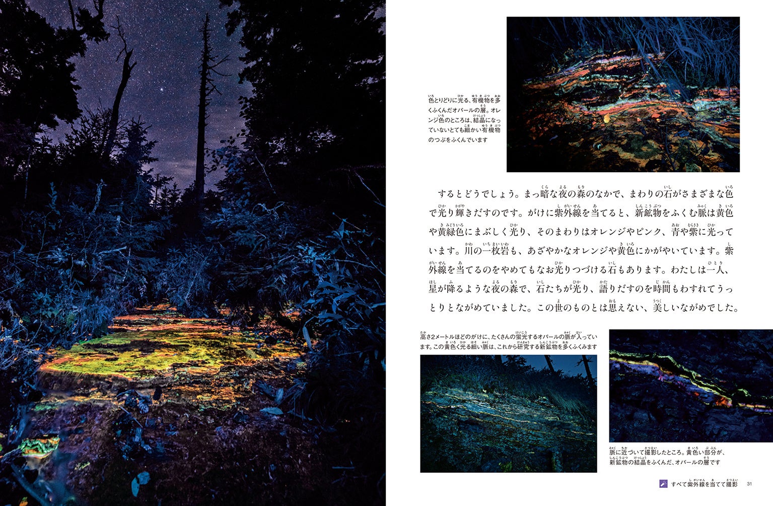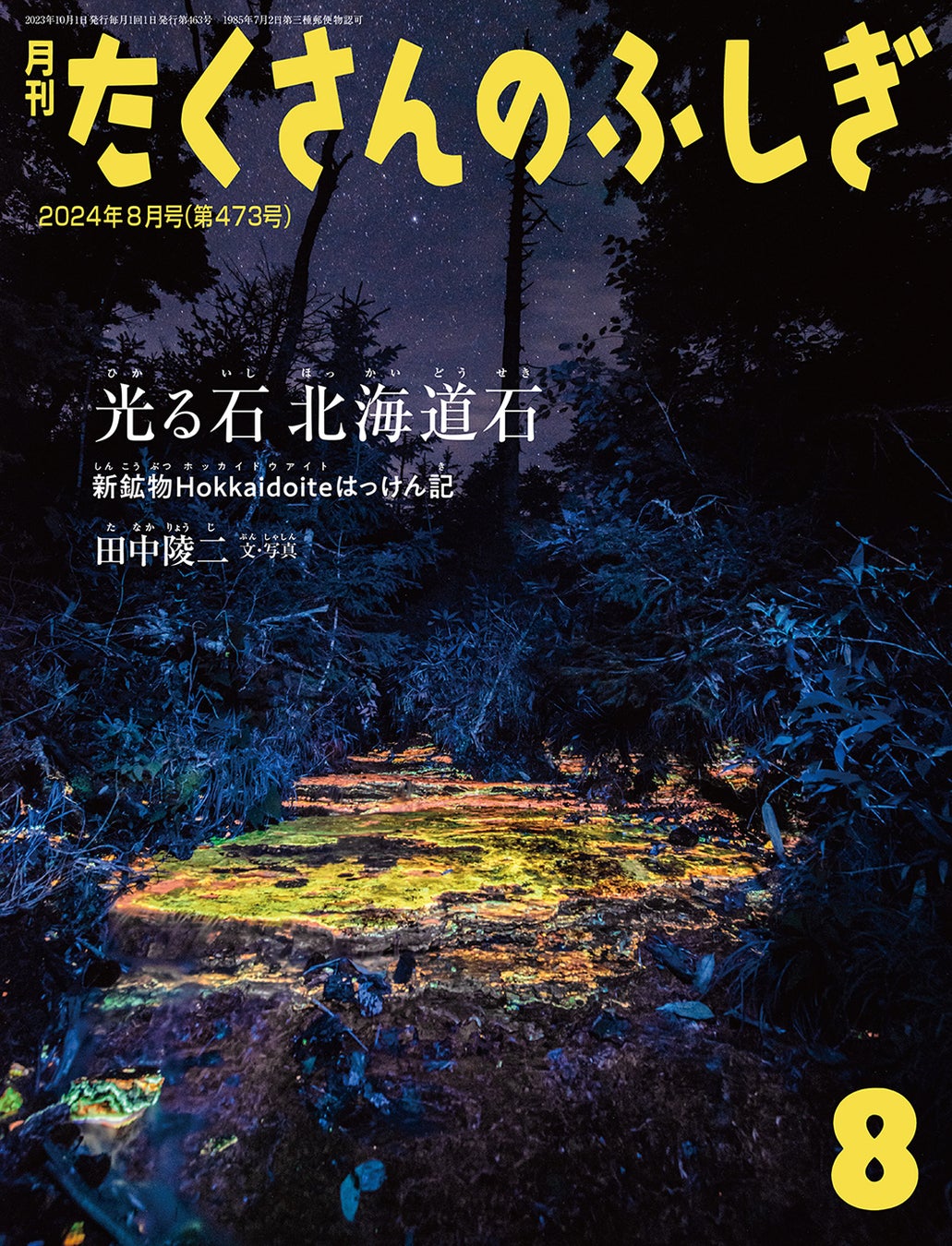 『光る石 北海道石 Hokkaidoiteはっけん記』(月刊絵本「たくさんのふしぎ」2024年8月号)は、炭素を含み、紫外線を当てると鮮やかな黄色や黄緑色に輝くという新鉱物「北海道石」が、2023年に発見・命名されるまでの経緯を豊富な写真と共に紹介する作品です。