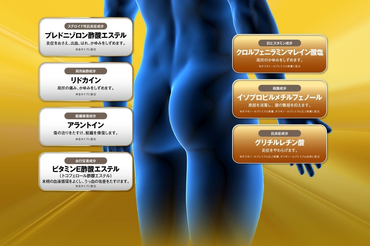 ボラギノールプレミアムシリーズは、それぞれの剤形に合わせて異なる処方設計を採用しました。