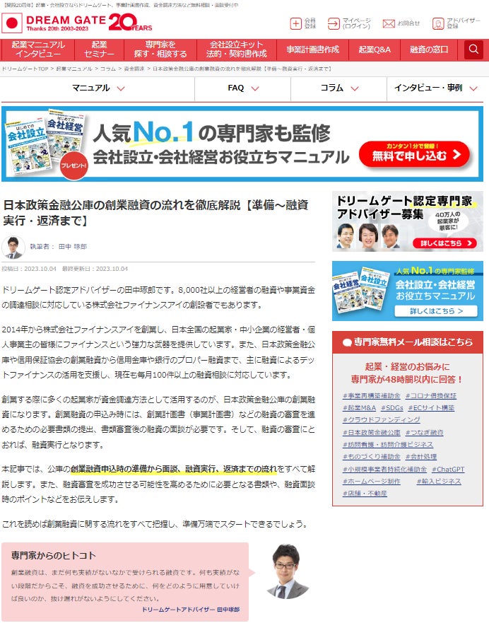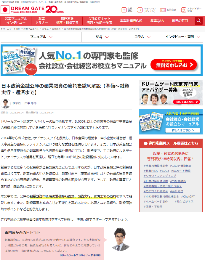 『日本政策金融公庫の創業融資の流れを徹底解説【準備~融資実行・返済まで】』ファイナンスアイが日本最大級の起業支援サイト【ドリームゲート】にて