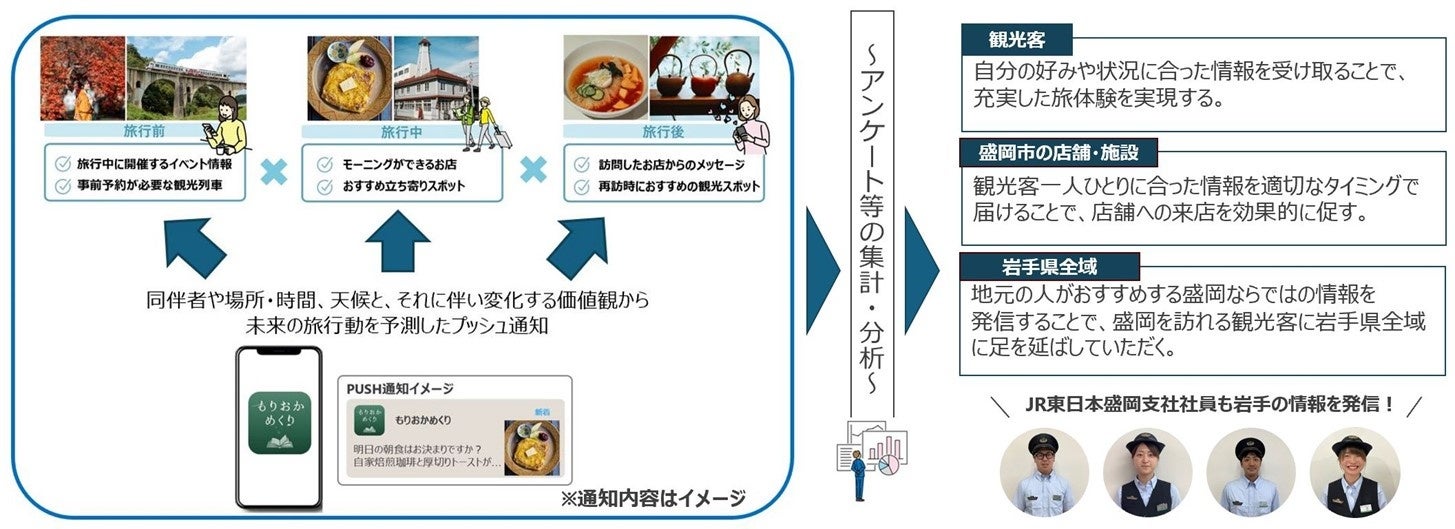 今回の実証実験では、次のステップとして、「回遊率の向上」や「地域ファン創出」に取り組みます。未来の旅行動を予測したプッシュ通知を行い、よりリアルタイムに観光客に合わせたレコメンドの情報を通知します。その効果を検証することにより、盛岡市内および岩手県全域への回遊促進に貢献します。