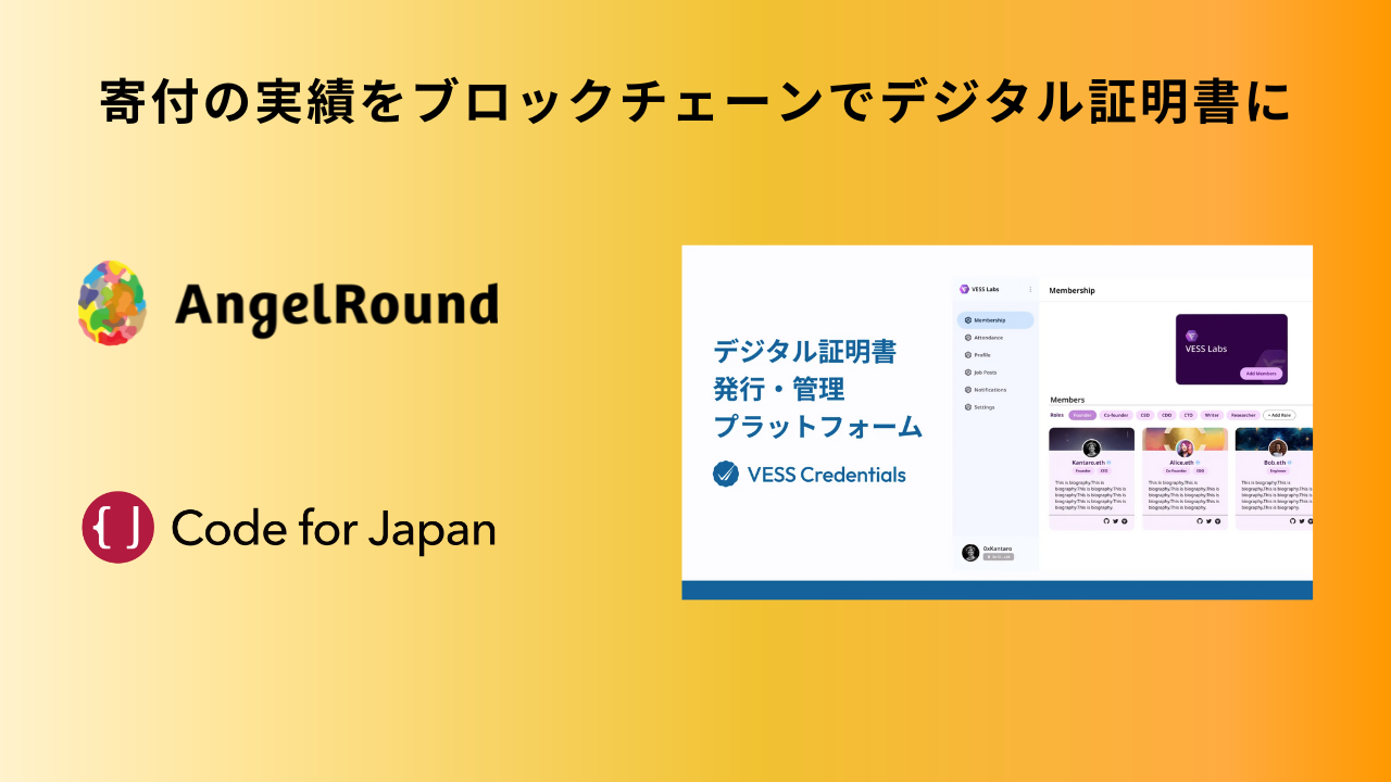 今回、実験的にVESS LabsのKantaroさんが提供している証明書発行管理プラットフォーム「VESS Credentials」を活用することにしました。VESS Credentialsは、ブロックチェーン技術を使って証明書を発行・管理できるプラットフォームです。VESS Credentialsを活用することで、寄付をした事実をブロックチェーンにしっかりと残すことができるようになります。