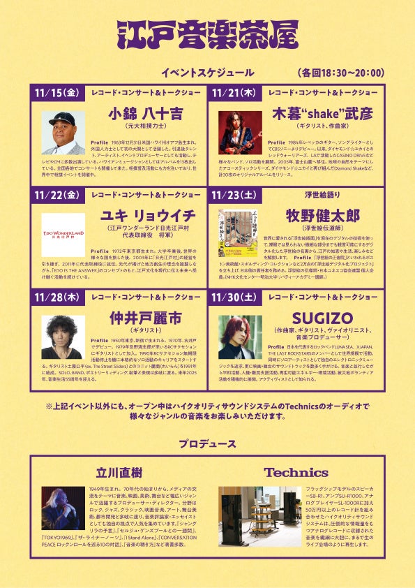 今回、プロデューサー立川直樹氏(株式会社時代村顧問)が推奨するTechnicsの総額1,000万円弱のスーパーオーディオシステムを持ち込みロックや邦楽、ジャンルを超えた様々な音楽がハイクオリティサウンドで流れ続ける極上音楽イベントを開催いたします。