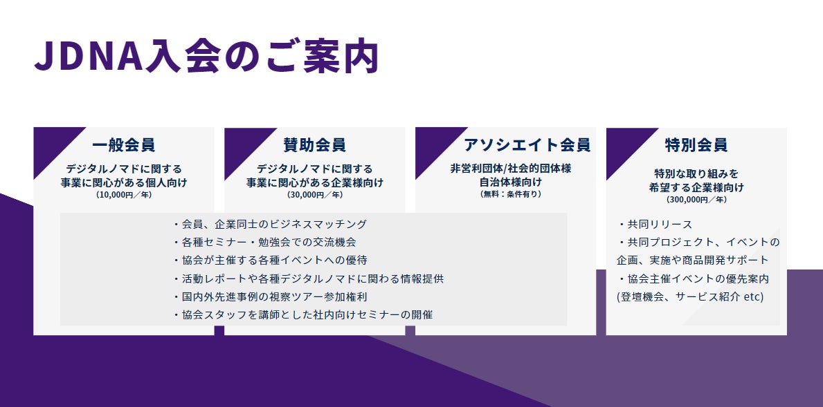 JDNAでは、日本の地域の魅力や相互の交流を通じて、場所をとらわれない生き方をするデジタルノマドが日本で過ごしやすい社会を目指し、JDNA会員の入会を受け付けています。
