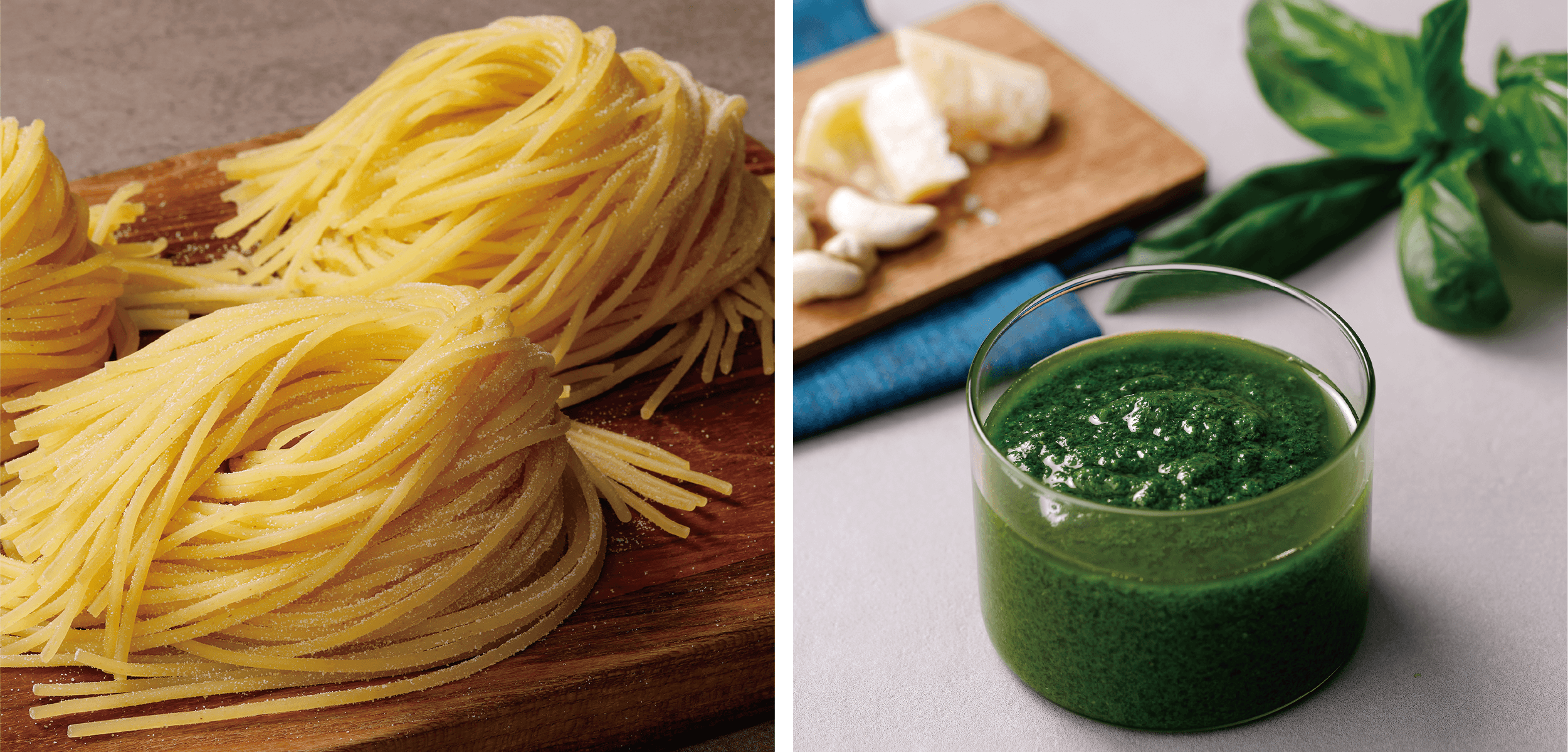 ファンの多い香り豊かなバジルソースは、契約農家から仕入れたフレッシュなバジルを使用。鮮やかなバジルグリーンは、発色剤などを使用せず加熱方法だけで保っており、その製法は特許を取得しています。