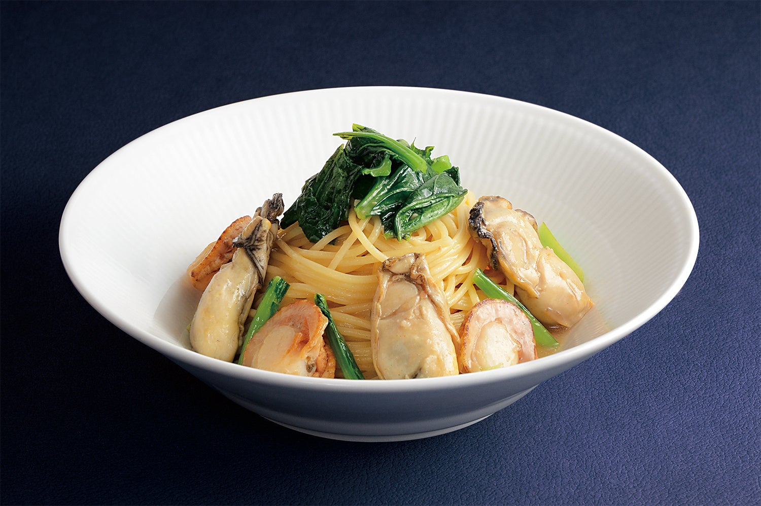 冬の味覚である大粒の広島牡蠣と帆立を贅沢に使ったオリジナルの和風パスタ。アンチョビバターと醤油が素材の美味しさを一層引き立てます。