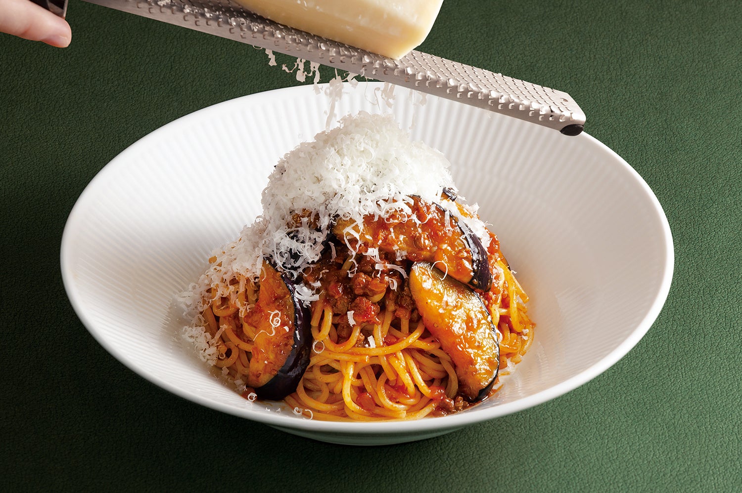 絶品ミートソースとみずみずしいなすのパスタ。ふんわり粉雪のようなイタリア産パルミジャーノチーズをたっぷりかけることで、香りとコクがさらにアップします。